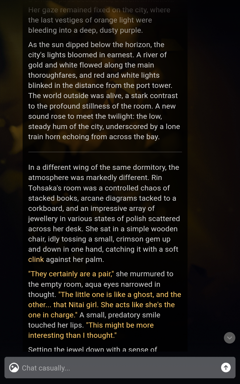 >>1536882 Ну да. А внутри там что? Всё тот же обмен короткими фразами? Без смены сцены, без прогрессии сюжета? Чары просто болтают ни о чем 3000+ токенов?