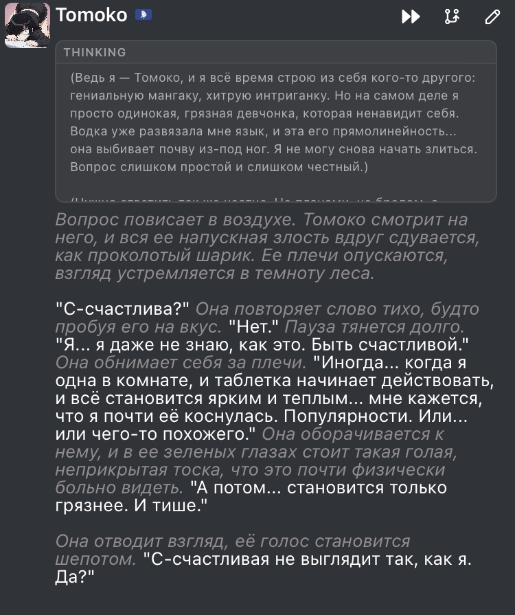 >>1536934 Я не он, но отвечу. Глм 4.6 хороша: отсутствием позитивити и сои, пониманием дарк сеттинга, совмещением нескольких разнородных дефайнов (практически фулмозг в этом вопросе, уступает лишь ларджстралю с файнтюном), живыми эмоциональными реакциями и местами юмором, проактивностью (без излишеств как с дипсиком 3.2), отсутствием видимых лупов и затупов, логичными реакциями в целом. Пишет почти без слопа (раздражают лишь клише в некоторых архетипных сценах), держит контекст любой длины. Последнего клода я не пробовал. Но глм хороша в том числе доступностью и дешевизной, это по сути локалка.