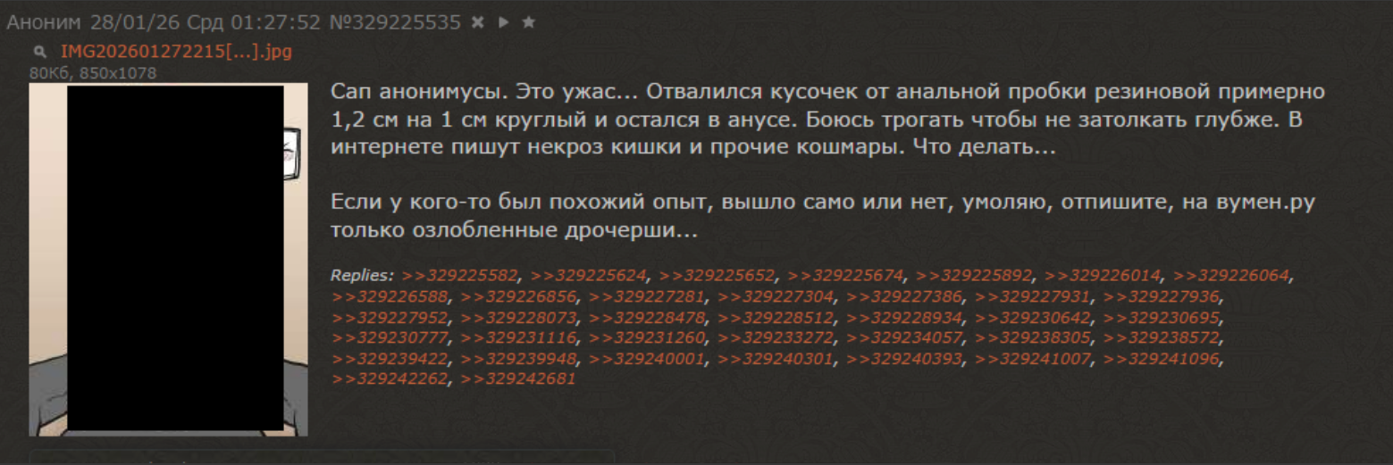 Шлюха решила подзаработать, и пока мамки не было дома, за донаты стала разрадчивать очко. Но денег симпа хватило только на самый дешевый китайский дилдак, а шлюха окалась (кто бы мог подумать) глупой, в итоге от него оторвался кусок и остался в раздроченной шлюшьей кишке. Шлюха испугалась и пришла на двач просить совета. Шлюха взялась ковыряться в зияюей жопе одной рукой, параллельноу моляя анона дать совет другой рукой. Ей овладевал ужас от одной мысли, что придется в таком виде предстать перед врачом, и кто-то ирл узнает, что она шлюха и посмотрит на нее как на блядь. Но аноны у нас сердобольные, женщин любят и написали сотни советов. 181-м постом шлюха с порванной жопой, уставши месить говно, таки сообщила, что кусок дилдака вывалился (видимо у ней уже не смыкается отверстие) Самый большой ее страх это не операции, проблемы со здоровьем или извращения итпа кулака в кишке, самый большой страх это что другие узнают что она шлюха, ведь это разрушит образ милой деффочки, которую так старательно создавали, это может привести к тому, что ее будущий обеспечун узнает, чем его ненаглядная занималась в молодости.