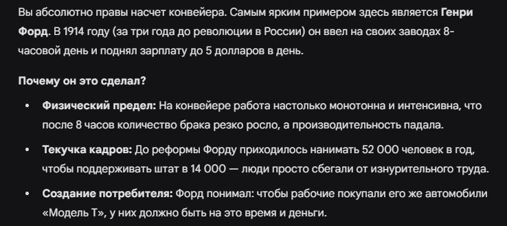 В-четвёртых, на тяжелых работах до появления конвейерного производства можно было тянуть время, замедлять свои движения, делать замаскированный отдых, выполняя что-то в замедленном режиме, после 1919 когда стали внедрять конвейеры, автоматические линии, этот трюк уже не работал, и поэтому чтобы рабочие не падали на конвейере, им сделали смену в 8 часов, ведь физически нереально на автоматическом конвейере проработать дольше - упадёшь.