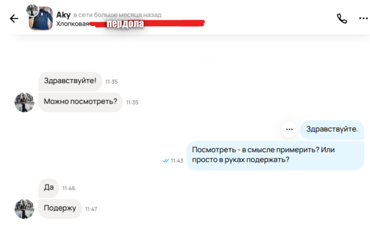 Ещё пример конченого пидораса. То есть у нашего ОХУЕННО ЗАНЯТОГО деятеля "хватило времени" на то чтобы зайти на сайт/в приложение, тыкнуть в переписку и прочитать... а на ответ, видите ли, не хватило. Бедненький, как же он найдёт время отдать/отправить товар. Особенно орейро что такие "занятые" обычно чуть ли не каждые полчаса в сети.