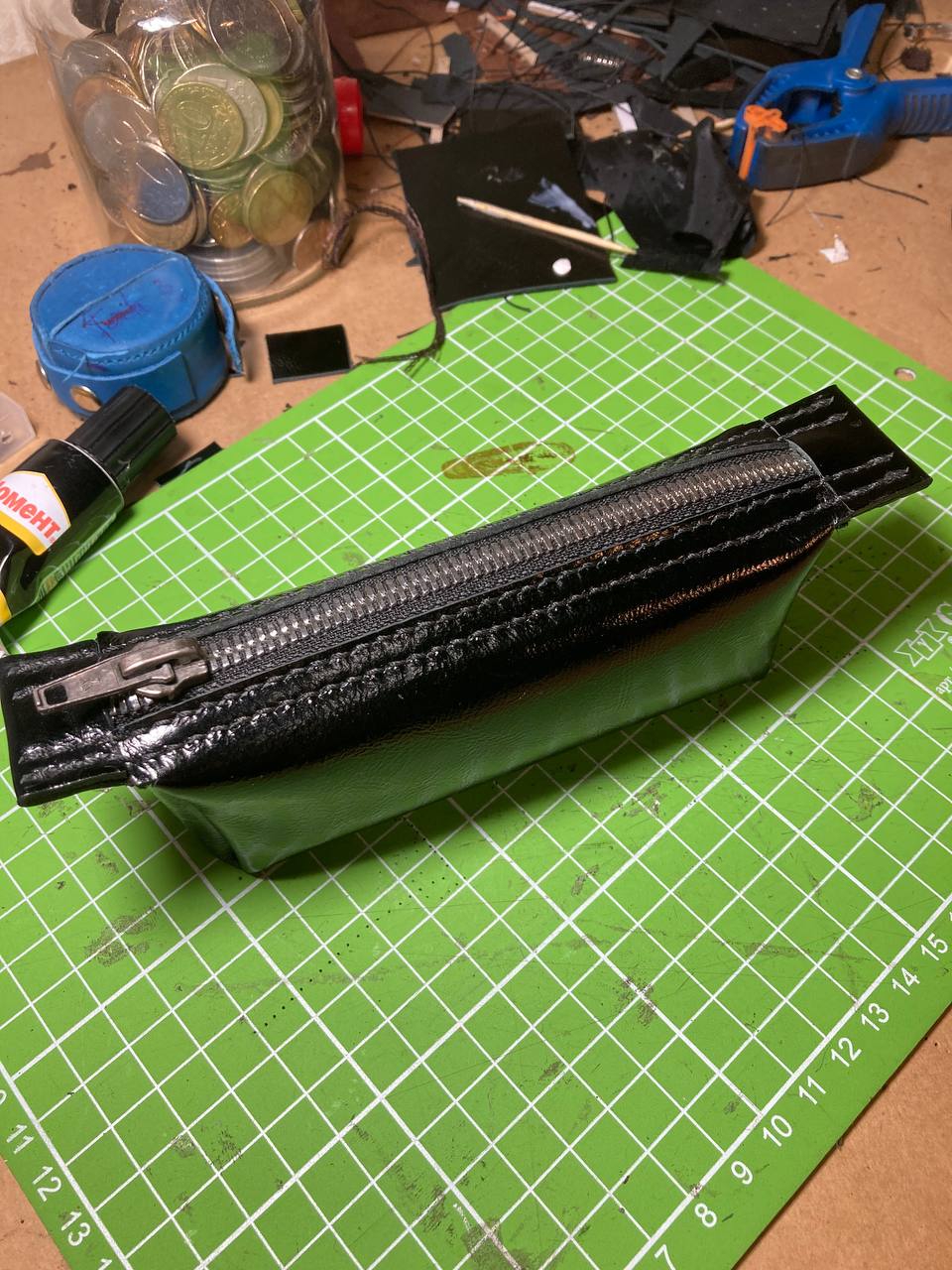 >>817312 Выглядит одновременно брутально (лаковая кожа, агрессивная молния) и дёшево (подкладка так себе, лучше что-то контрастное было сделать, а молния все же скорее будто грязная). Шов красивый, уголки ровные. В целом отлично, как будешь использовать?