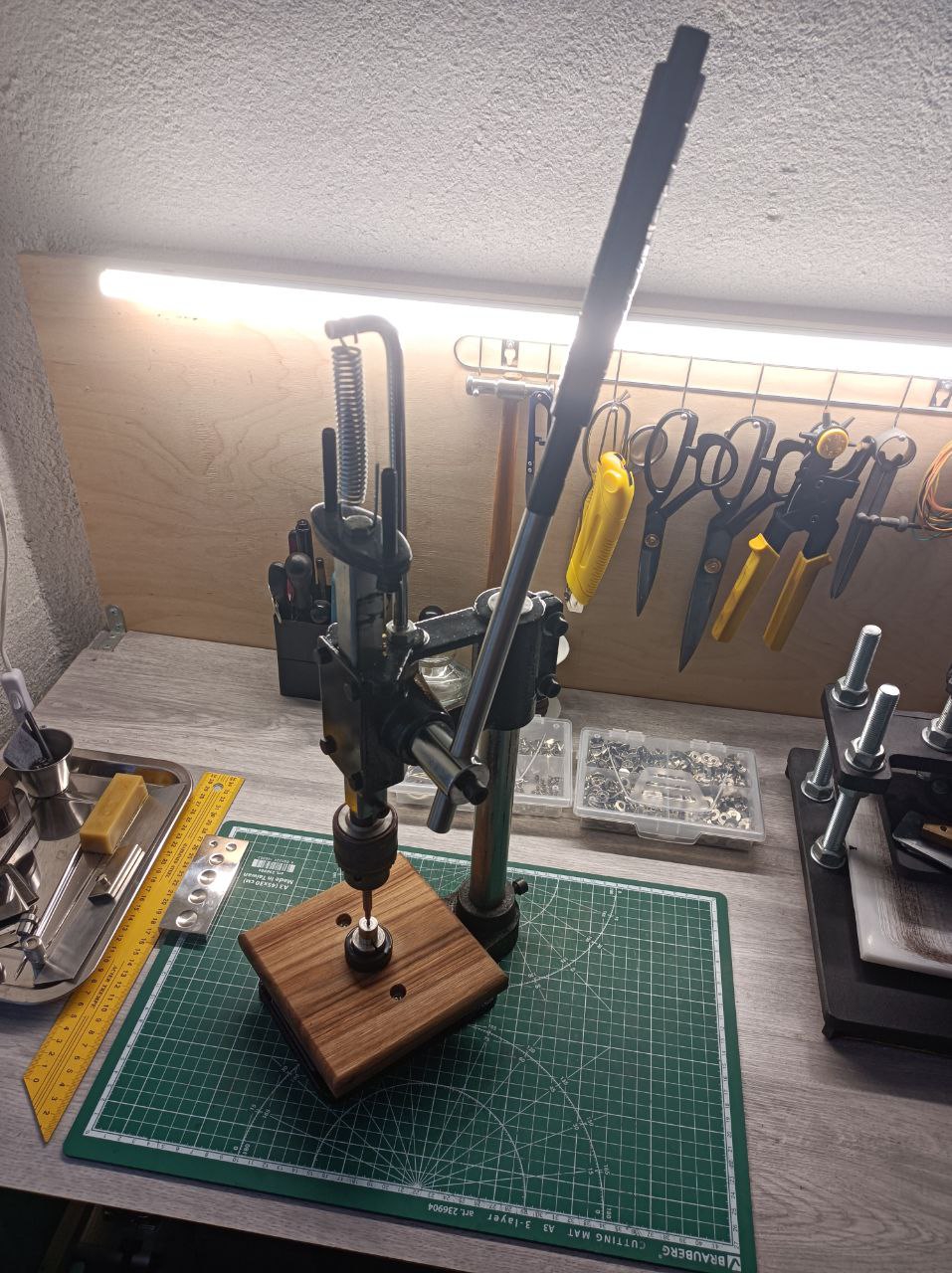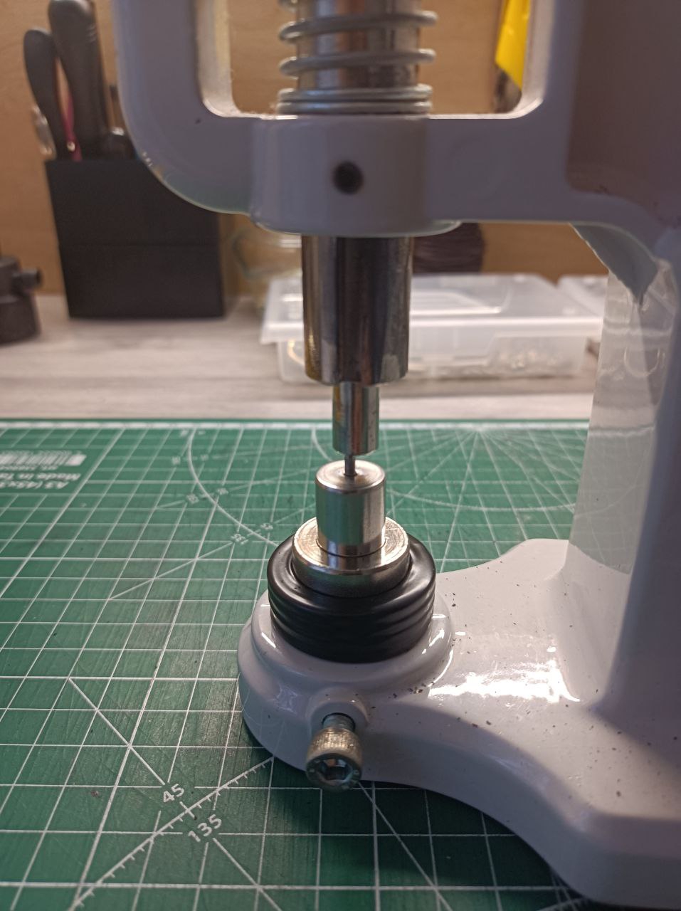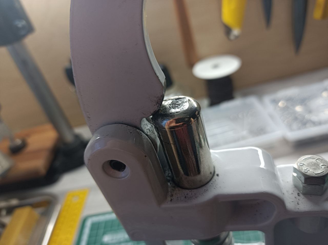 >>820930 >Потому что это доступная и недорогая хрень для домашнего хобби. Все с ним нормально ставится Ключевое - "для хобби". Вот первые два пика - это то, что происходит с ТЕРом за полтора года эксплуатации. Слизывается цилиндр, совсем уходит из без того паршивая соосность. Плюс маленькая длина рычагая себе чутка плечо ушатал даже. Еще раздражающие моменты - долго и неудобно насадки менять, и нет возможности изменить высоту. Лучший вариант для меня оказался: взять китайский реечный пресс, поменять штырь на цельнометаллический, родной патрон на человеческий, поставить рычаг подлиннее и площадку скрафтить. Вышла шикарная штука под любые пробойники/высекатели/насадки. И бюджет не то чтобы кусается - около 8к итого. Вполне себе доступно.