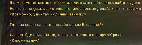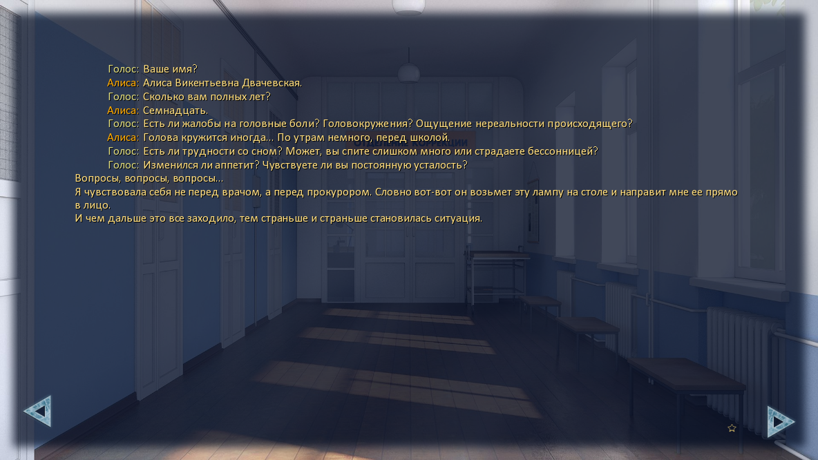 >>1123745 Вот тебе текст mt "Двачевская! Ты на третью смену ехать собралась?" "Я подскакиваю, едва не столкнувшись лбами с вожатой." "Мы одни во всем автобусе." dv "А где…" mt "Уехал домой." "Странное чувство накрывает с головой: это не злость, не обида, и даже не грусть." "Это ощущение, что я сама себя обманула, от которого хочется то ли плакать, то ли смеяться." "Ну конечно, Алиса, ты ведь с самого рождения верила, что у тебя все случится, как у Золушки!" "Придет добрая фея и оденет тебя не в обноски, а в модные цветные колготки и платье подружки невесты, а потом появится принц и заберет тебя в дом, где у тебя будут все-все игрушки, какие ты пожелаешь!" "Только вот цветные колготки вышли из моды, а принц… точнее, богатый посольский сынок в импортных джинсах, повел себя именно так, как ему подобные и должны вести себя с девчонками вроде тебя, сиротками без приданого." "Поматросил и бросил." mt "Забудь о нем, Алиса." "Шляпа теперь говорит со мной не как с подопечной – как с подругой." "И в ее голосе слышится странная горечь, и как будто немного понимания." mt "Он вряд ли приедет снова. Его место там, на Кубе." "Она даже не смотрит на меня, но ее голос отчего-то дрожит. Неужто жалеть меня вздумала?" "Я и сама себя пожалею!" "Потеснив вожатую в проходе, я выхожу из автобуса. Не прощаясь." "Потому что прощаться навсегда не люблю. Нос от этого больно уж щиплет…" voice "Ваше имя?" dv "Алиса Викентьевна Двачевская." voice "Сколько вам полных лет?" dv "Семнадцать." voice "Есть ли жалобы на головные боли? Головокружения? Ощущение нереальности происходящего?" dv "Голова кружится иногда… По утрам немного, перед школой." voice "Есть ли трудности со сном? Может, вы спите слишком много или страдаете бессонницей?" voice "Изменился ли аппетит? Чувствуете ли вы постоянную усталость?" "Вопросы, вопросы, вопросы…" "Я чувствовала себя не перед врачом, а перед прокурором. Словно вот-вот он возьмет эту лампу на столе и направит мне ее прямо в лицо." "И чем дальше это все заходило, тем страньше и страньше становилась ситуация." "Принц не уехал просто так. Он оставил мне плеер – на память, чтоб его!" "Небось каждую смену такими игрушками разбрасывался." "Нас, провинциалок, впечатлить нетрудно, тем более заморской техникой." "Но вот только плеер этот казался мне знакомым." "Он не был похож на громоздкий плеер Мику, и кассеты в него вставлять не требовалось." th "Любопытная штуковина…" "Подумала я, прежде чем бросить его вглубь тумбочки и завалить ненужным мне хламом." "Хотела выбросить, но рука не поднялась – наверняка дорогущее устройство, тонкая техника. Отдала бы кому, да жаба задушила." "В конце концов, каким бы этот мажор ни был подонком, он подарил этот плеер мне!" "О плеере я вспомнила только в конце сентября." "День выдался паршивым, а мой магнитофон в очередной раз зажевал кассету, и я со психу порвала пленку." "Кассету было жалко, но себя еще жальче." "Вытряхнув из тумбочки весь мусор, я изъяла подарок мажора, хоть и зареклась к нему не прикасаться." "Включила и сунула в уши наушники." "И первой же заиграла та песня, которую он включал для меня на сцене." th "Не пускать сопли!" th "Это ничего не значит! Просто музыка!" th "Хорошая музыка, между прочим. На Сплин похоже, сто лет их не слушала…" "На маленьком экране действительно бежала по кругу строка Сплин – Романс." "Я со вздохом закрыла глаза и легла на спину – чтобы слезы катились обратно." "Зарядки был