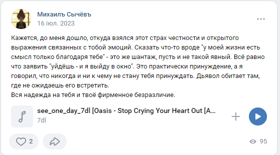 >>1225098 >самостоятельную новеллу от амбалов. А ты задонатил на рав4 чтобы амбалы тебе показали свою самостоятельную новеллу? >>1225100 >>1225104 От темпа выпал. Интересно, насколько там всё нечитабельно, потому что на вычитку и редактуру там времени просто не остаётся. А вот второе ожидаемо, т.к уже было подобное, с тем же Дорожным Димоном.