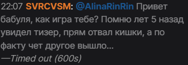 1. Эту никому не нужную хуиту помимо Скуфины стримили тяжеловесы вроде т2х2 и Дипинса. 2. Она прямо нацелена была на Зайчика. Сначала прошла радугу, это у нее заняло 4.5 часа, пусть и из-за дропов. В норме она после такого стрим завершает, но после еще играла и в зайца. В сумме у нее стрим вчера был около 9 часов. Для скуфы это пиздец.