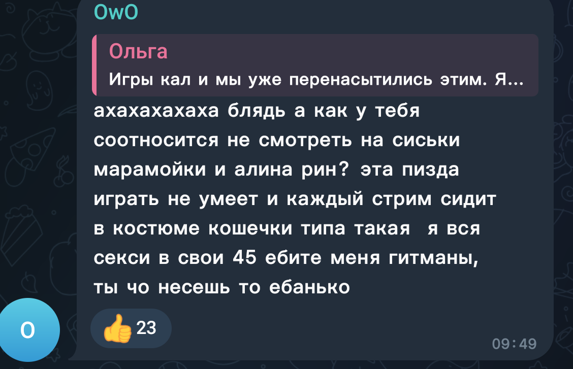 Меня лично от пиздежа этого манипулятивного трясет. Ты скажи просто и честно "мне нужны бабки (о которых она ныла еще до ивента), я буду вас прогревать, игры ваши нахуй не нужны, кошкам нихуя покупать не буду (даже на 1%) и мне похуй, что я строила из себя аристократку и воняла на тех, кто крутит ауки" Тогда будет ноль вопросов.