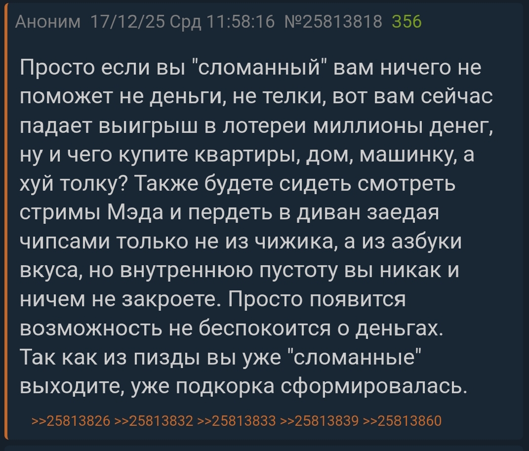 Просто если вы "сломанный" вам ничего не поможет не деньги, не телки, вот вам сейчас падает выигрыш в лотереи миллионы денег, ну и чего купите квартиры, дом, машинку, а хуй толку? Также будете сидеть смотреть стримы Мэда и пердеть в диван заедая чипсами только не из чижика, а из азбуки вкуса, но внутреннюю пустоту вы никак и ничем не закроете. Просто появится возможность не беспокоится о деньгах. Так как из пизды вы уже "сломанные" выходите, уже подкорка сформировалась.