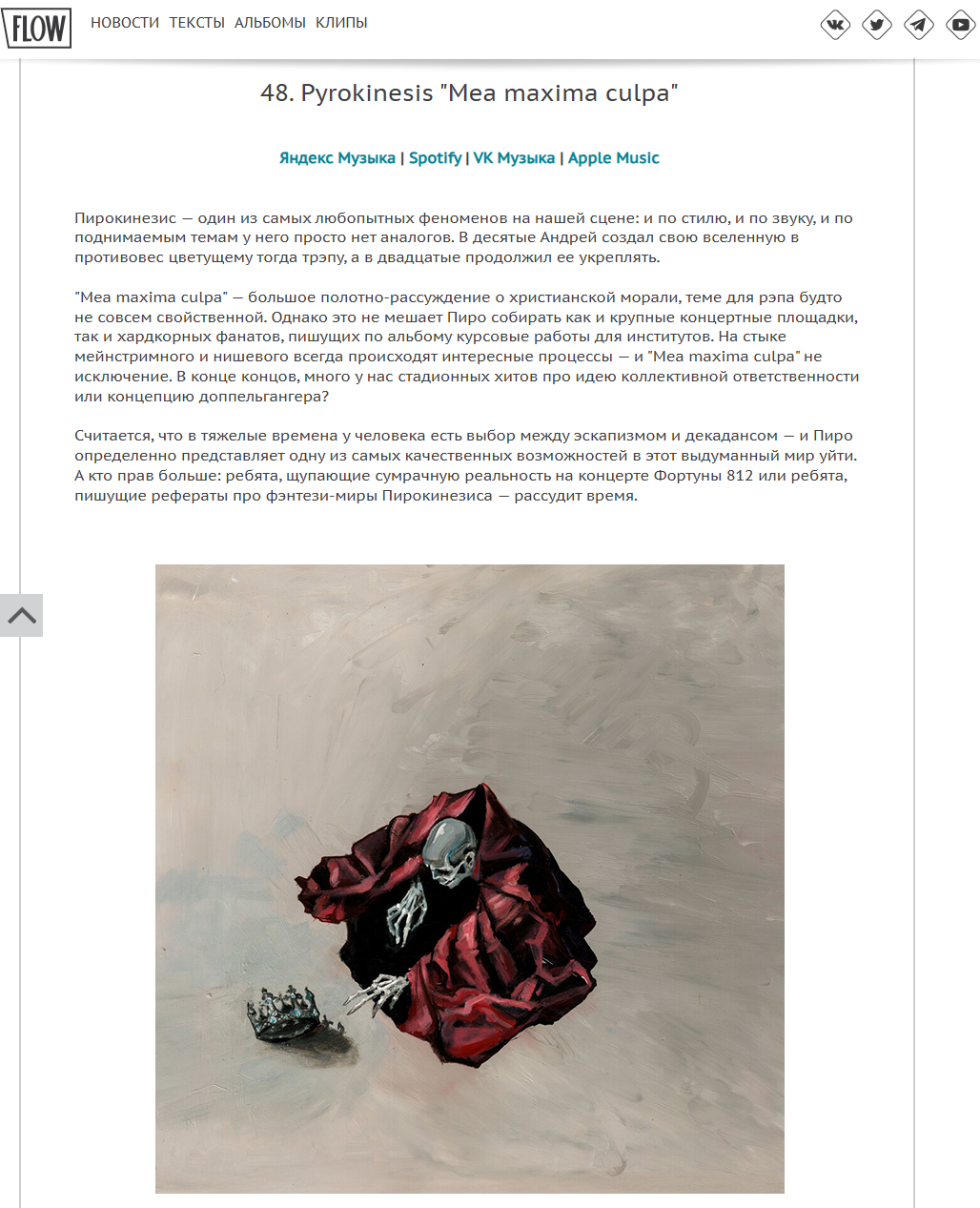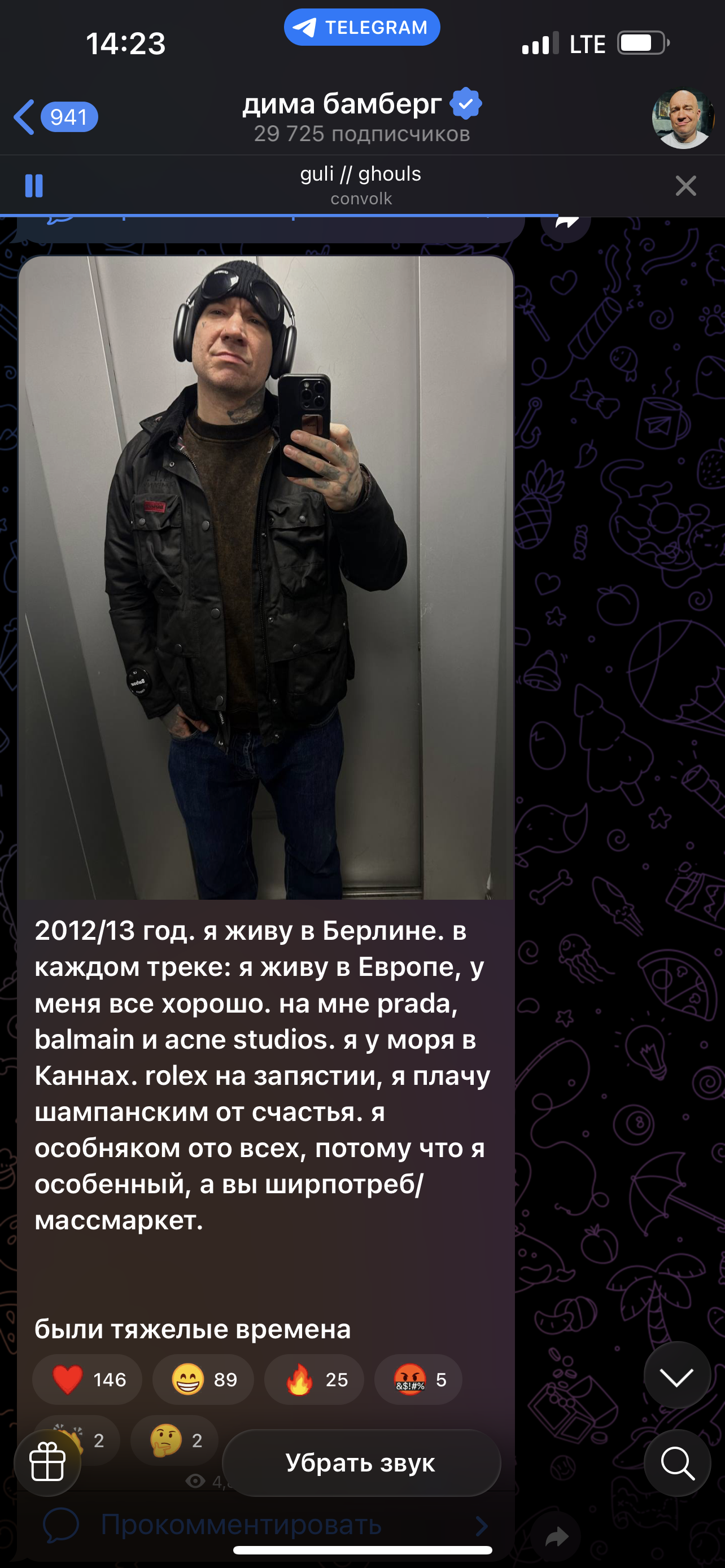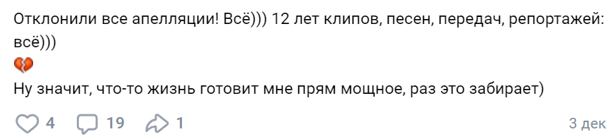 Ну вот и вк все Больно Но понимаемо, вокруг все такая блажь и зверинец. Всё эти движения, бывшие друзья, бывшие преданные и влюбленные много лет фанатки, активисты, глобалисты, патриоты, либералы, недоэксперты всех мастей и сортов со своим важным мнением, чтобы пнуть и самоутвердиться за счет этого, сми, отменяющие и прочие всех мастей. Для кого здесь быть публично активным? Частью чего? Надеюсь, не потеряем нишево. Не должны. Иначе был бы другой финал у альбома