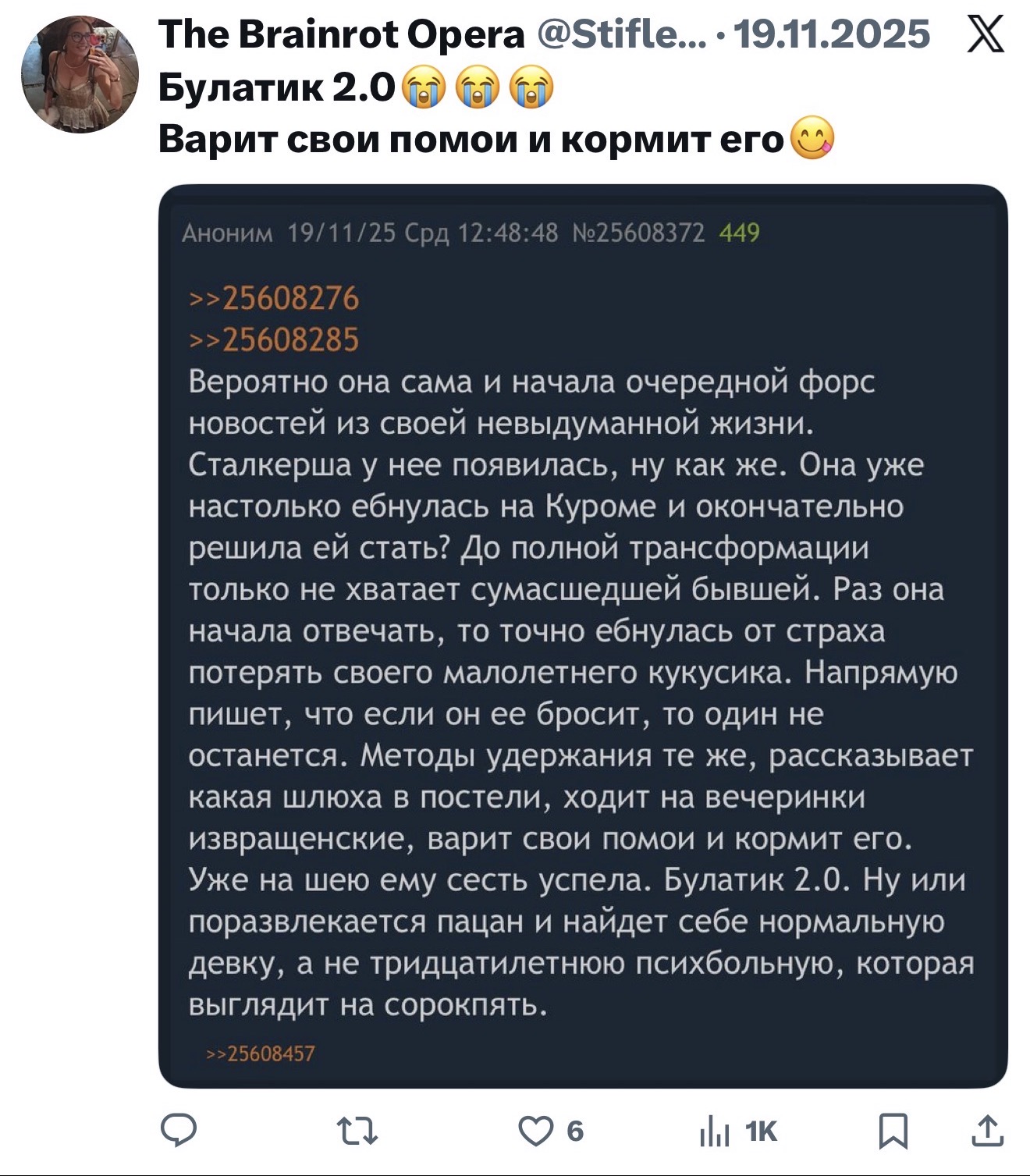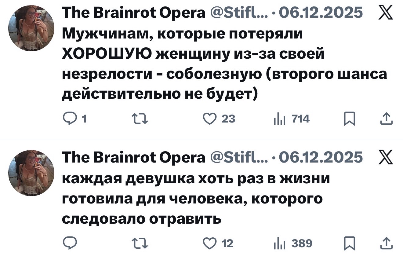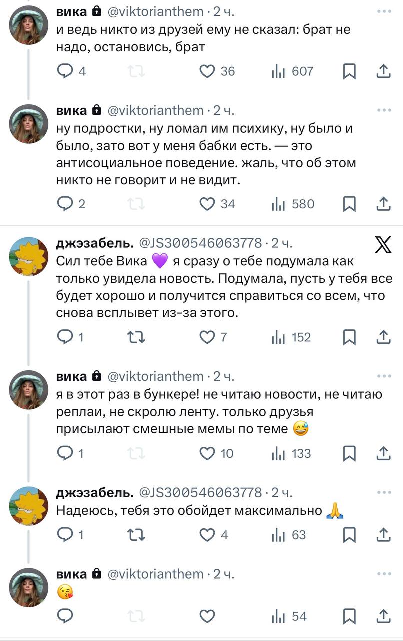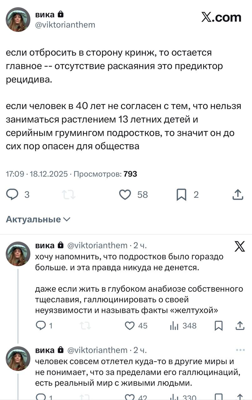>>25859367 сисуни считают, что у нее был некий фейк в твиторе и что на ютубе она под роликами с диларой высиралась. В твиторе она в том же стиле подсасывала миногу и натусику, еще что-то про посвящение оксижопича в лор антихайпа писала, мол, круто было бы. Пруфов ессно нет. Ник на ютубе - злоебучий сырничек, а в тгшке она вот такой войс отправляла (в конце про сырники): https://voca.ro/1lqEJnUaCvKo Но например если у неё есть поехавшая на оксе подписчица, то ниче не мешает ей их шиперить и защищать в стиле ебучей Балоры (фанатка жопича сидящая здесь), факт про линзы и авито мог быть рассказан в соцсетях натуськой или другими подругами оксижопича. Лысая тян марла (x.com/Judas_na_kreste/) тоже какие-то инсайды сливала, например про то что миног слепой со хрением -8 или -9 и как раз линзы носит, поэтому и пешки на батле были по пять рублей. Марла теперь его хейтерка, сто проц опрокинул её за сливы инфы и пиар на нем, вот и отомстила после расследования