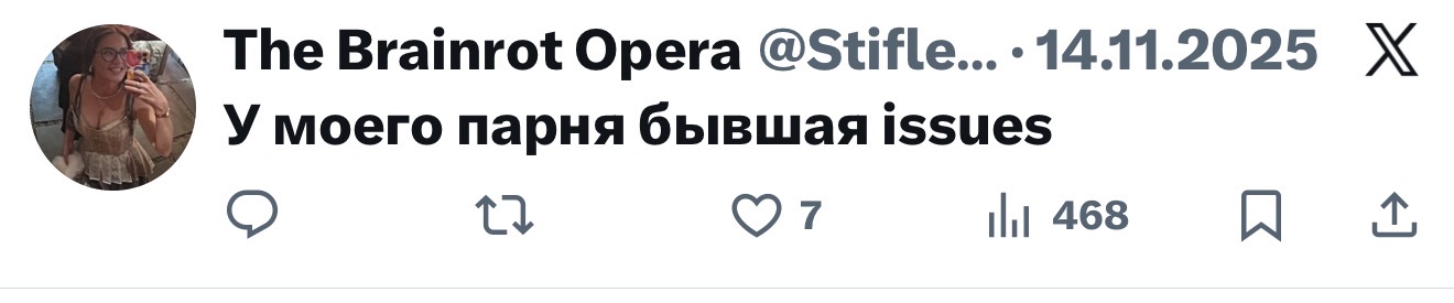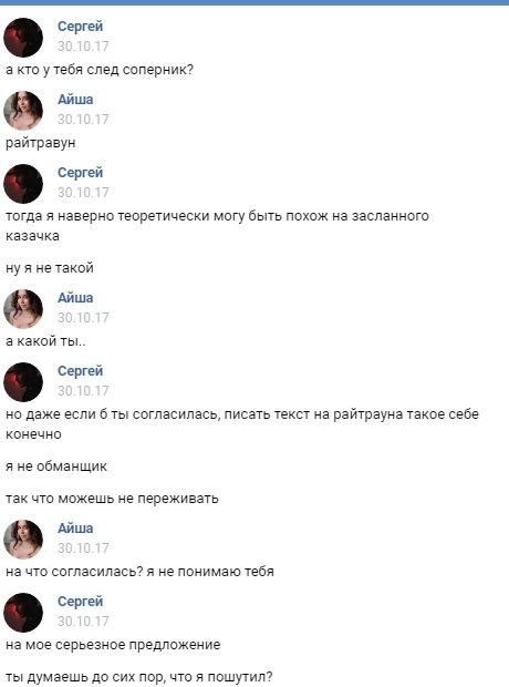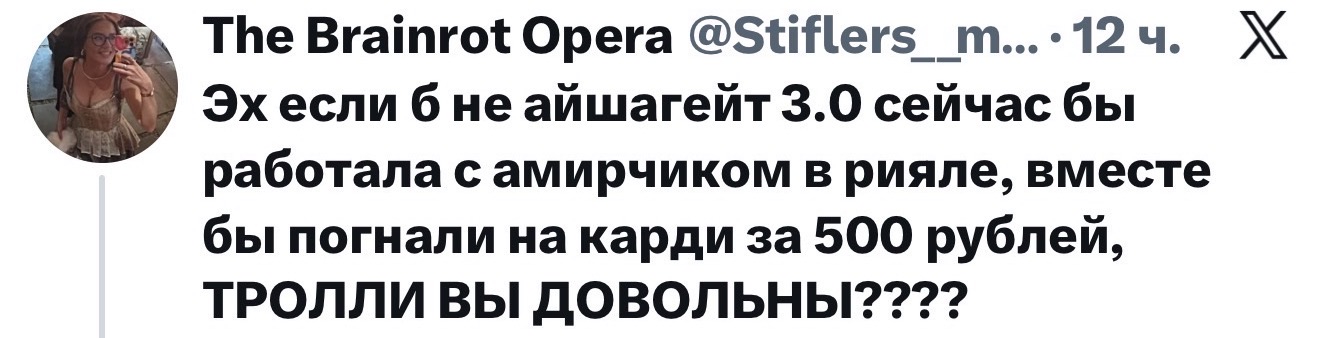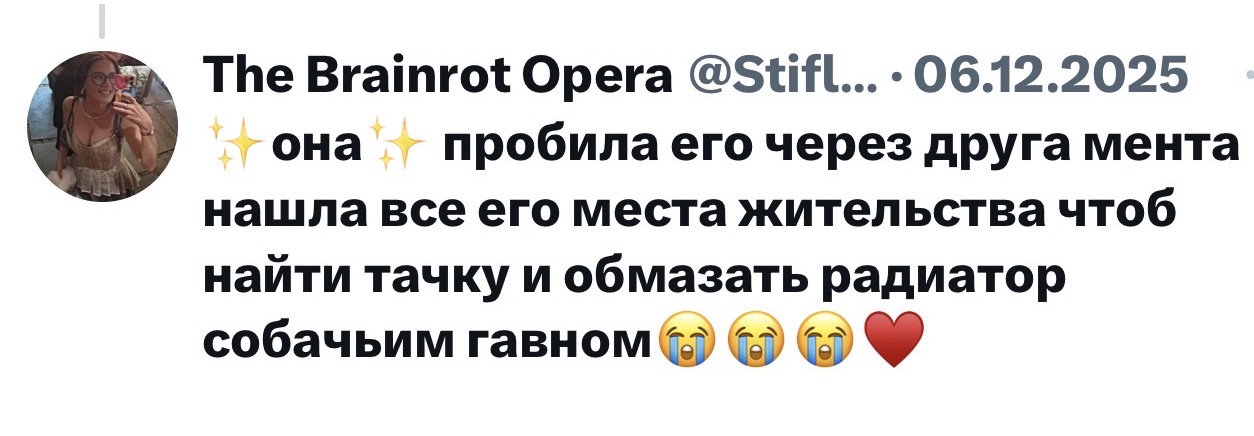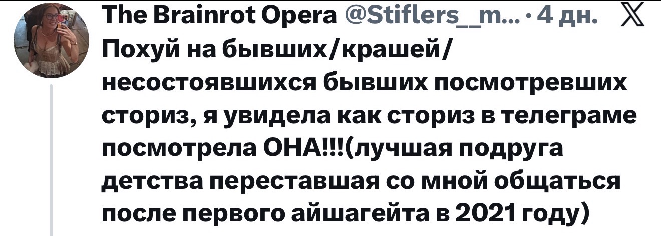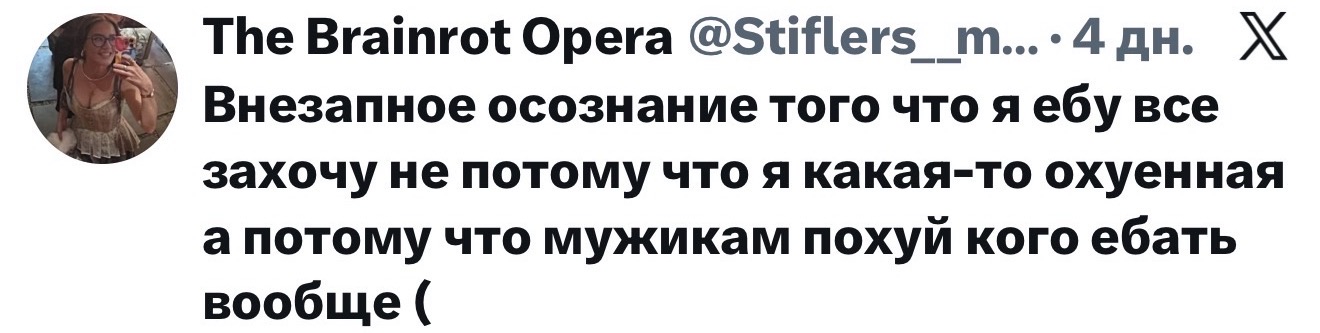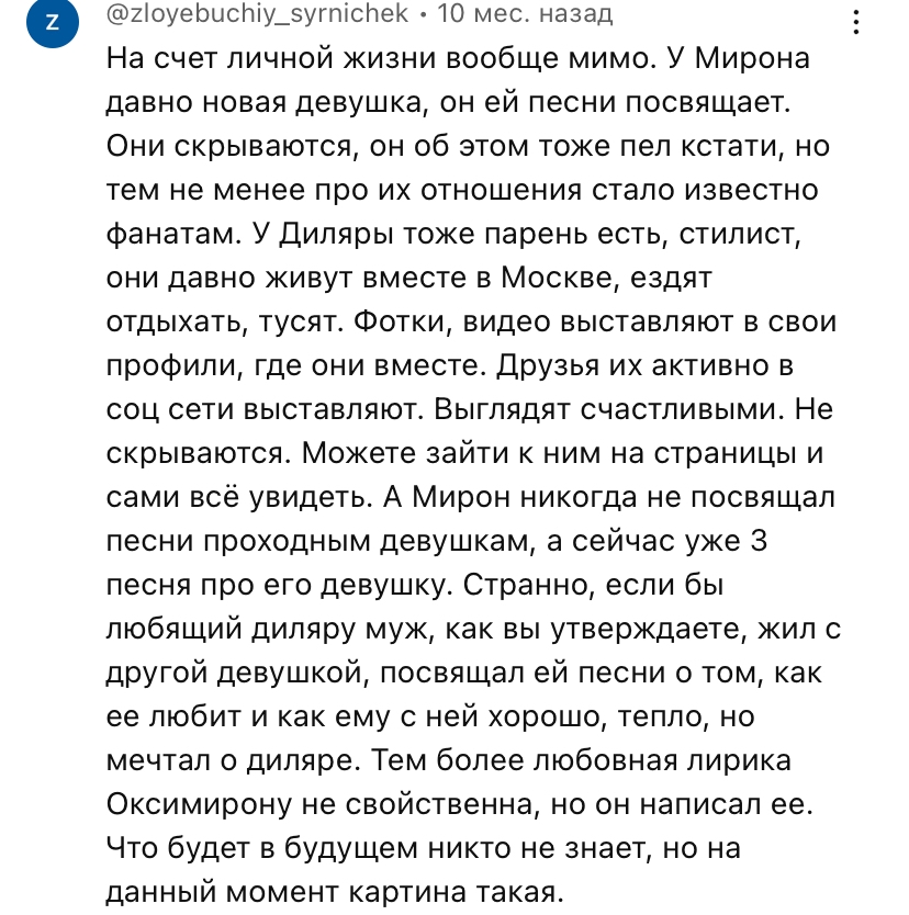 >>25863530 >Грезе что ли? Так грезе с ним и не встречалась, этот форс разогнала по приколу её подруга варя громова ака varo inside или как-то так. https://x.com/VariaVaria, она еще выкладывала фото розоватой дорожки порошка миф на экране смартфона с обложкой трека федука и джигли и расписывала тред про зависимость и аборт) Еще она одна из бывших зомая (кажись до сони) и у них потом даже чатик на 4-5 телочек был из бывших его
