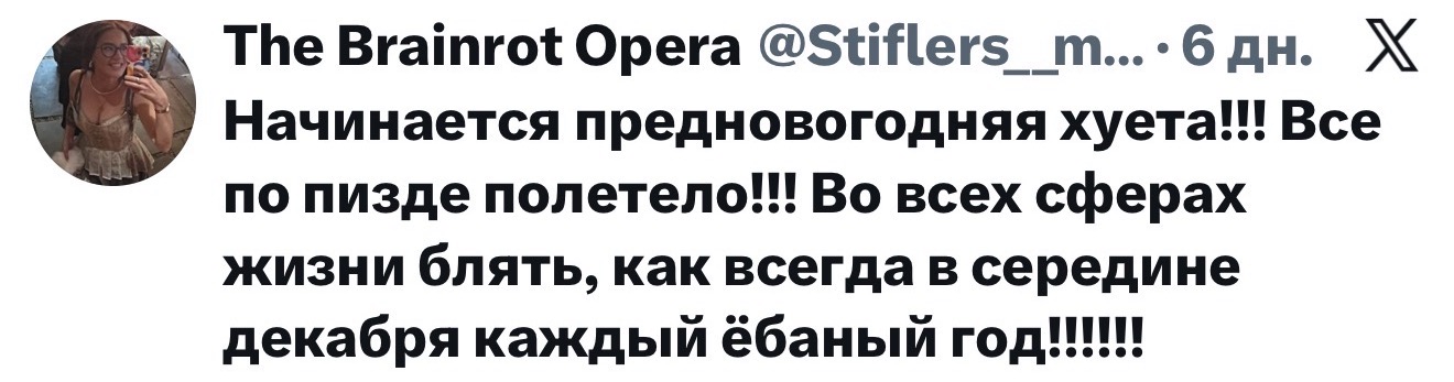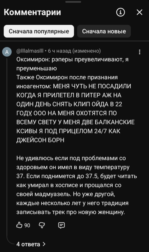 А вдруг у окси на самом деле все хуево. Реально рак какой-нибудь. И он решил перед смертью приколоться, мол, да не, у меня все хорошо, отдыхаю под пальмами, болезни никакой нет... Я сейчас расплачусь девочки... А потом он решит передознуться чтобы не умирать медленно и мучительно. И все будут гадать к чему был кринж альбом. А другие вспомнят строчки про это был не передоз и не самоубийство. Но это реально будет он потому что окси траванули какой-то хуйней и теперь он неизлечимо двигается к смерти