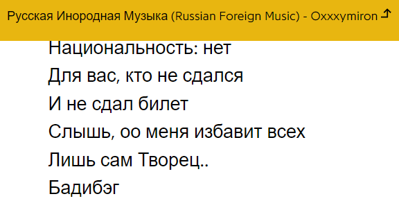 пиздец, там чмаскар каримов в прямом эфире на 8:45 снёс с гениуса аннотации Оксимирона, потому что Фломастер намошнил Оксимирона, блять, благодаря которому у нас вообще о гениусе узнали и начали пользоваться не попутал ли ты, псина? мдаа, кругом враги у Оксича еще Флом сидит с вылупившимися глазами "а чё, это он что-ли сам текста добавил???", прикинь да, старый дебил, Окс это делал ещё когда чурки родители чмаскара и не думали завести наёбыша https://www.youtube.com/watch?v=2vKdDTZ9WkU