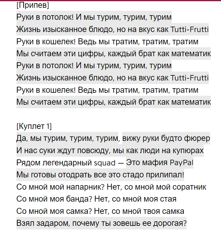 1. То что ты легенда - легенда 2. Парни собирают младшему на Сбер - это грев/Греф 3. И в ритм/ивритом 4. Посылки/по ссылке 5. На отъебись/на, отъебись 6. Бью по рукам/пускаю по рукам 7. Много с кем путался, но ни с кем меня не спутаешь