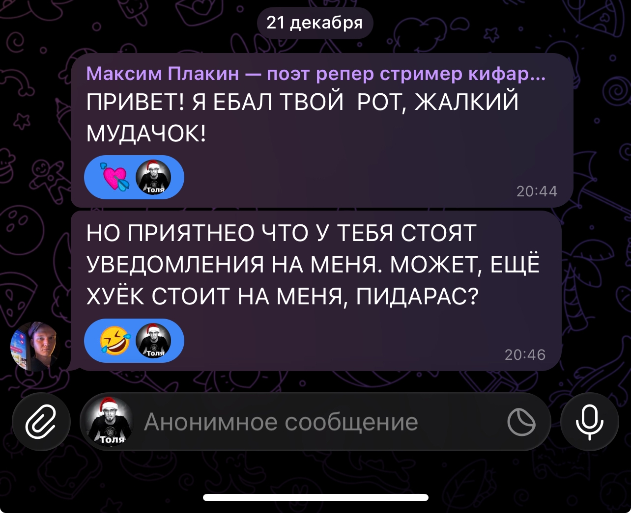 А че Славик то говна в рот набрал и молчит до сих пор?? Не, я канеш понимаю что я него уже "Свой Лор", что уже не по масти и не по кайфу доедать калтент, пилить рофлокаверы, потешаться на стримах над Носом, но как будто бы можно было бы чисто пукнуть какой-нить ненапряжный постик в тгшку по ситуации, не?? Причина молчания?? Он типа так играет новую роль, что он уже якобы типа вырос, сам уже стал таким дохуя самостоятельным модным певцом и теперь такие приколы ему уже не соответствуют? Я хуею с этой дуры, сидит сиськастая тётя шлюха и который день подряд дрочит какие-то каловые всратые никому не нужные (кроме даунов) футболки у себя в канале и за все это время ни одного нормального поста по делу, пидарок даже на стрим наебал который обещал провести в субботу!! Короче Жопич хуесос сын шлюхи, тащемта всё.