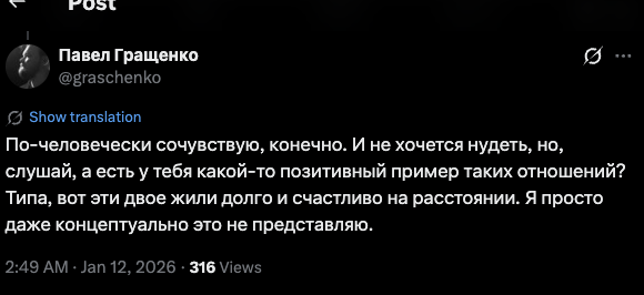 >>26040585 Заметьте рассталась не спокойно, даже в посте подколола его, дескать, он не смог познать внутренний дзен отношений на расстоянии, а вот Я-ТО ПОЗНАЛА.
