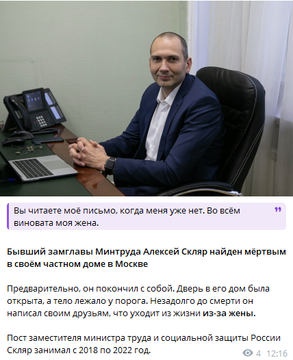 Жена экс-замглавы Минтруда Алексея Скляра отказалась комментировать SHOT суицид своего супруга. Именно её чиновник обвинил в своём самоубийстве Женщина занимается бизнесом — на неё зарегистрированно ИП, специализирующееся на торговле сигаретами и мелкой рознице. У неё также были свои кофейни. Кроме того, у неё были собственные салоны красоты, однако в начале этого года она закрыла бизнес. До этого она работала в медицинском учреждении. У пары было двое сыновей, один из парней заявил нам, что давно не общался с отцом и не знал о его смерти.