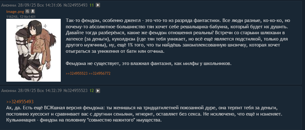 Я бы обратил внимание на четко выраженный фаллический характер того, что пациенту постоянно мерещится хуй (ц) на то, что тред начали с обмена гендерными ролями, а дальше быстро перешли к страпонам и плеткам. Можно подумать, мужики только и занимаются в постели тем, что унижают и мучают бедных женщин.