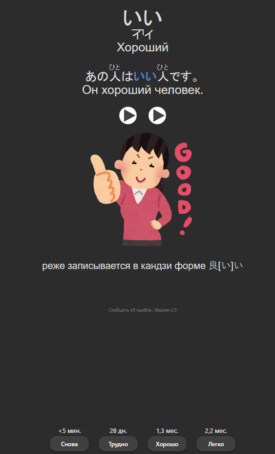 2. Любимый контент +google +анки (опцион) +Rikai/Nazeka/Yomichan(опцион) Использовать анки + готовую колоду (вариант, в общем-то, один https://ankiweb.net/shared/info/3173403321 ), можно начать сразу после заучивания хиракатакан. Только не стоит пытаться за раз учить по 100500 карт. В начале может показаться, что это легко. В колоде имеется некоторое количество опечаток, например, とがみ вместо てがみ.