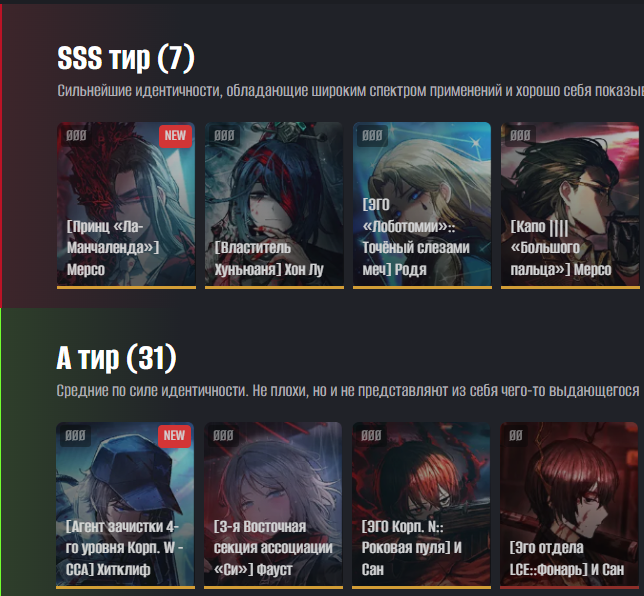 Сайт, который пытается быть полноценной датабазой по лигмусу, удобнее игры для впитывания объективной информации по игре, но гайды, тирлисты и субъективщину там пишут какие-то тормознутые чертилы, которые нихуя ни в чём не разбираются: https://www.prydwen.gg/limbus-company/identities/