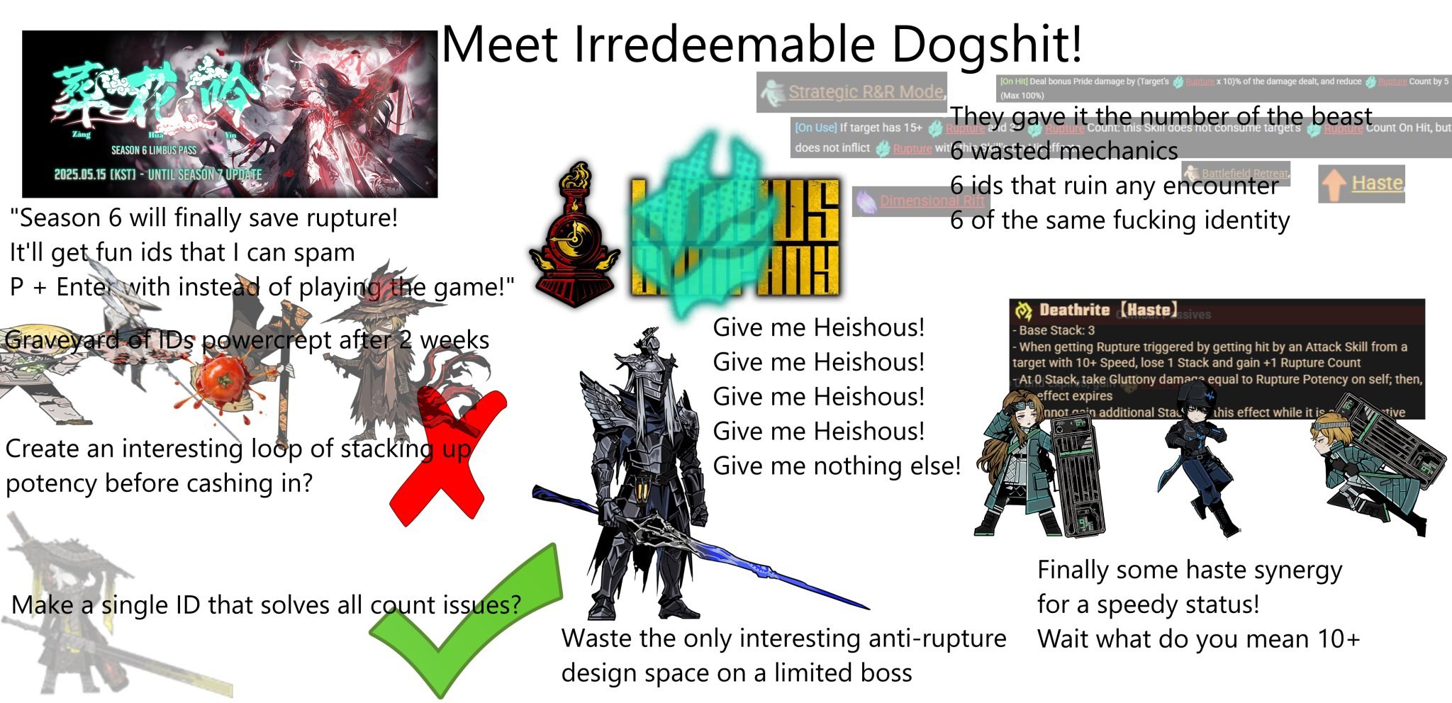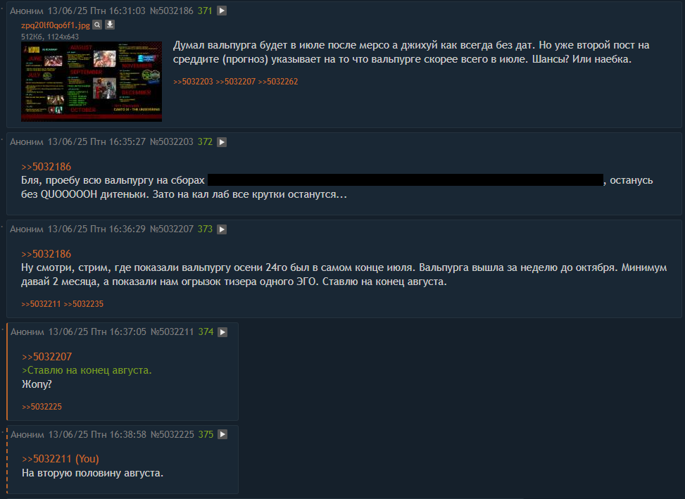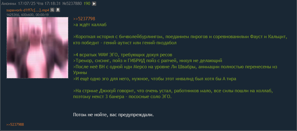 Катастрофические последствия ушкокаллаба вообще закончатся когда-нибудь? Сначала отмена второго ивента и рейлвея, потом сам каллаб с наплывом аркодетей, карнавализация фурриблядством, теперь вот "вальпурга" без нихуя с ноунеймами из отмененного ивента в главной роли. Дальше видимо сделанное на коленке канто, полное сюжетных дыр и несостыковок, которое постоянно отсылает к несуществующему ивенту. Ну хоть потом, после этого всего пиздеца, игра излечится от удара, нанесенного каллабой ебучей? Или эта гниющая рана просто убьет Лимбус нахуй и Джихуй начнет главы переписывать и укорачивать, просто чтобы больше пилгримаджей оф калпашна запихать в свой разработанный барским сапогом анус?