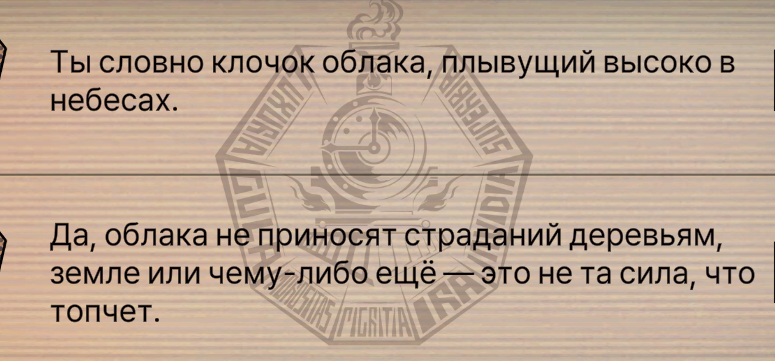 Явахуе Ну это реально уже не смешно Буквально каждый 2й диалог вот такой, всё канто такое Если бы это была пародия на "китакальные сеттинги" то я бы понял, но я же знаю что они серьезно это всё писали... Это как классическое агушное "паймон покакала паймон покушала" но уже противоположенная крайность, но всё так же это просто вода и ноль смысла.
