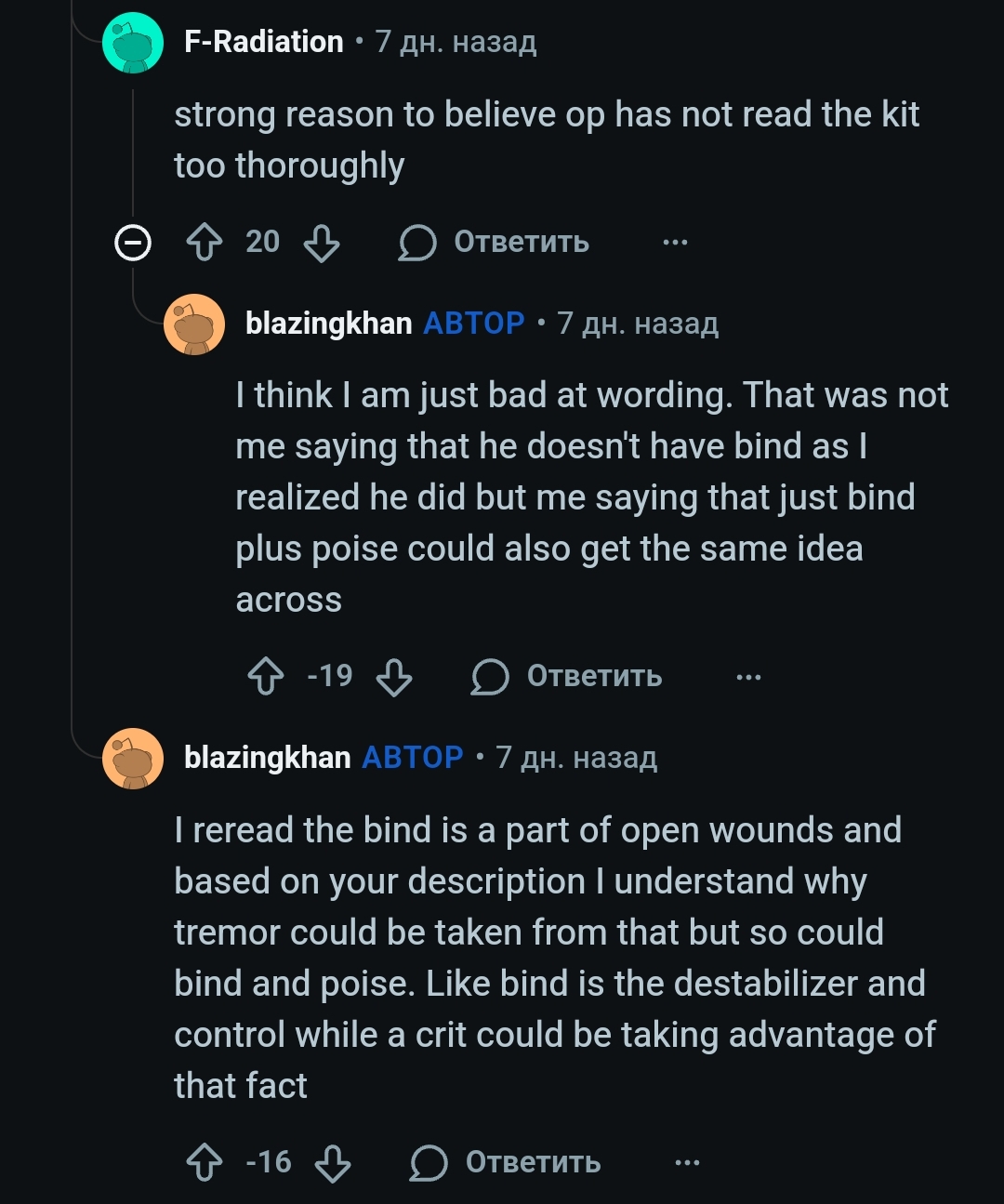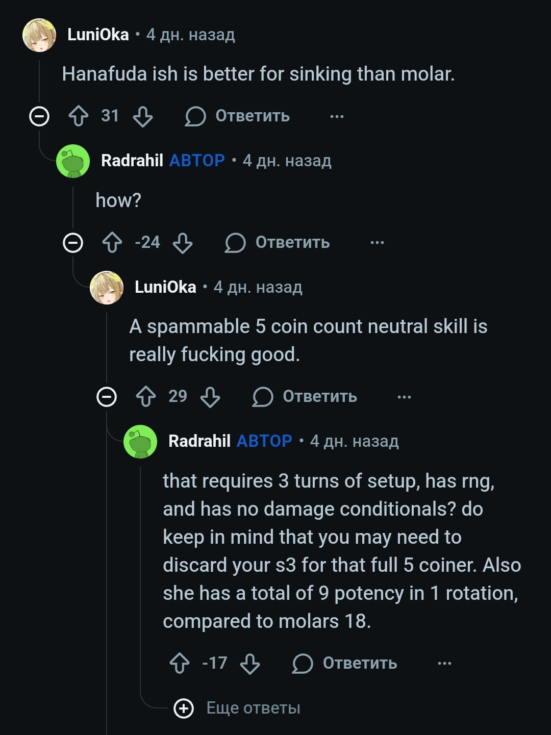>>5915647 Я не считал, а так прикинул. Посчитав там 5-6 ходов и выходит, если на первый скипать ход. В начале пятого будет приблизительно 14 6.5, в конце 17 8 на греге и 11 6/14 7.5 на роде. Неправ я был в том что "слетает за пару ходов", потому что кондиша с2 без костылей они вряд ли достигнут в принципе (за типичную схватку) для того чтобы кровоточить пойзом. В опасности слёта будет только родя, если ей "повезло" критовать на разгоне.