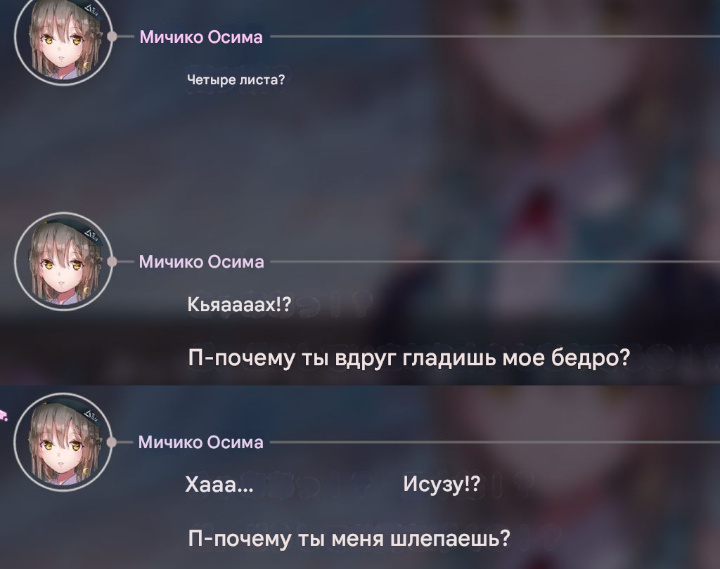 >>5566957 У нее в 5.1 веселый бондинг сначала был где она суперклеем приклеилась к рукой к руке к Руке. Мне кажется вся идея ивента была с этого бондинга взята и по таймлайнам сначала 5.1 был потом ее ивент. Потому что то у нее там очень смешное выяснение отношений началось, и она там явно не симпила по Руке как в конце ивента. Эти ее возмущенные переспрашивания по 10 раз..