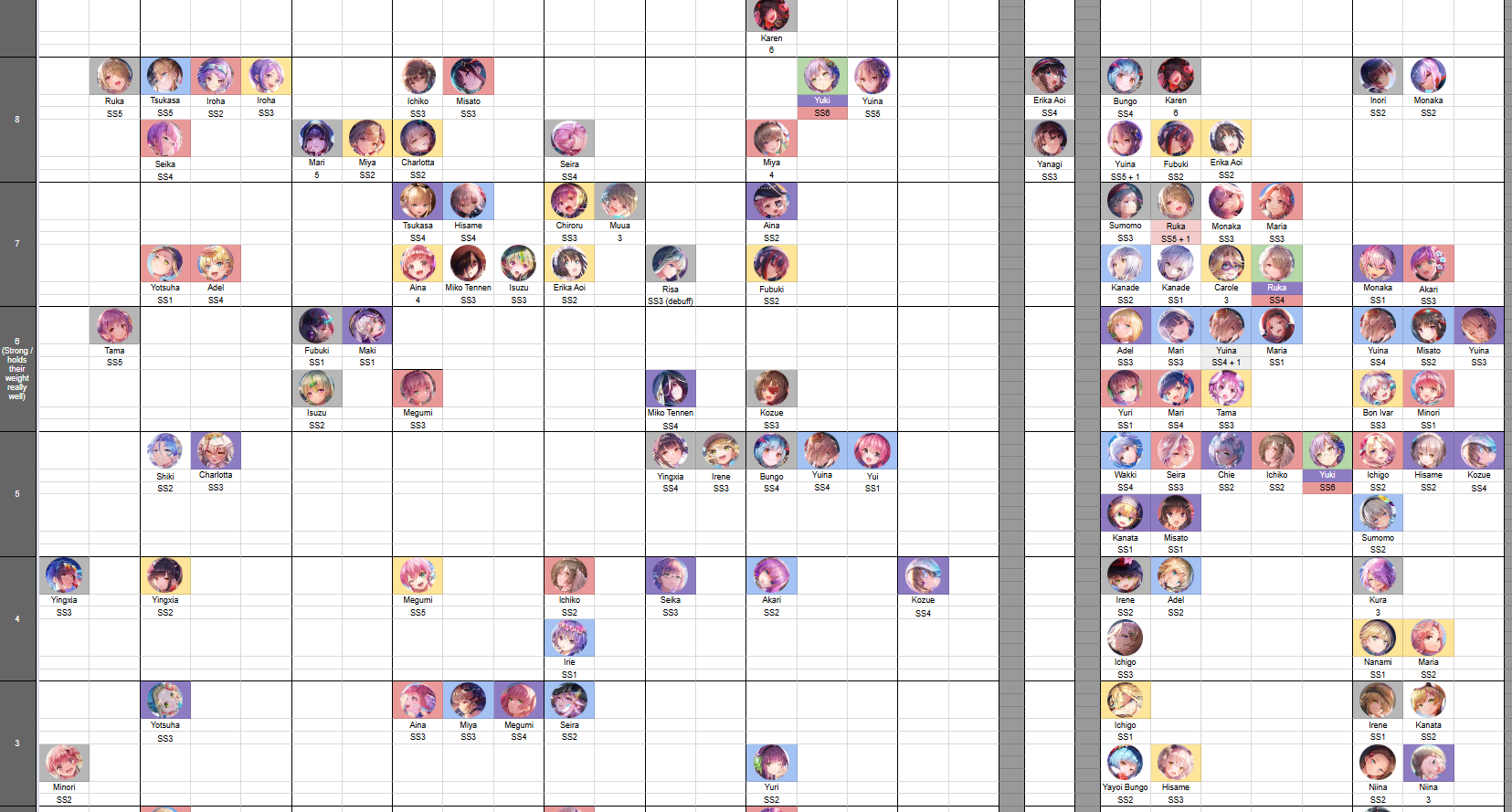 Минори высоко в т6 сидит в аое дамагерах) Имхо Ецуха слишком высоко сидит, она ничего не делает чтоб так высоко сидеть. Дарк и лайт Ецухи в разы сильнее. У дарк Ецухи конечно бафы не скейлятся потому что она не Адель урон в ульте скейлится. В целом в контексте можно понять почему те или иные лучше других в вакууме. Весь тир лист расчитан на тех кто не хочет сам разбираться в пачкостроении, если самому разбираться то большинство т1-3 там вполне могут вытянуть как т6.