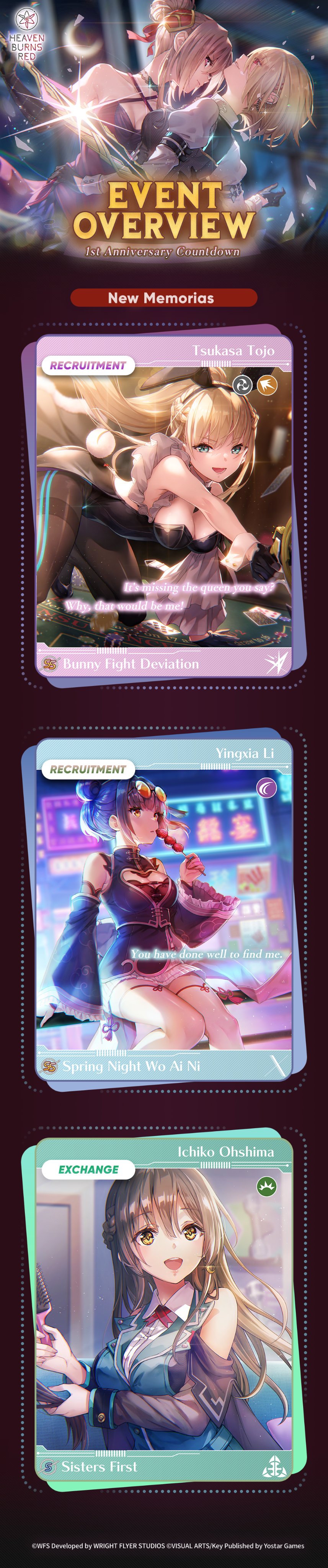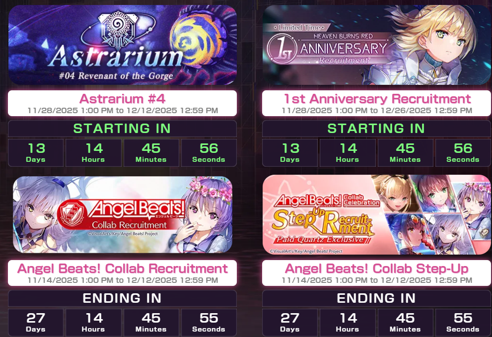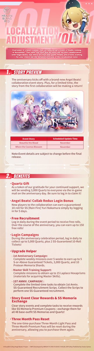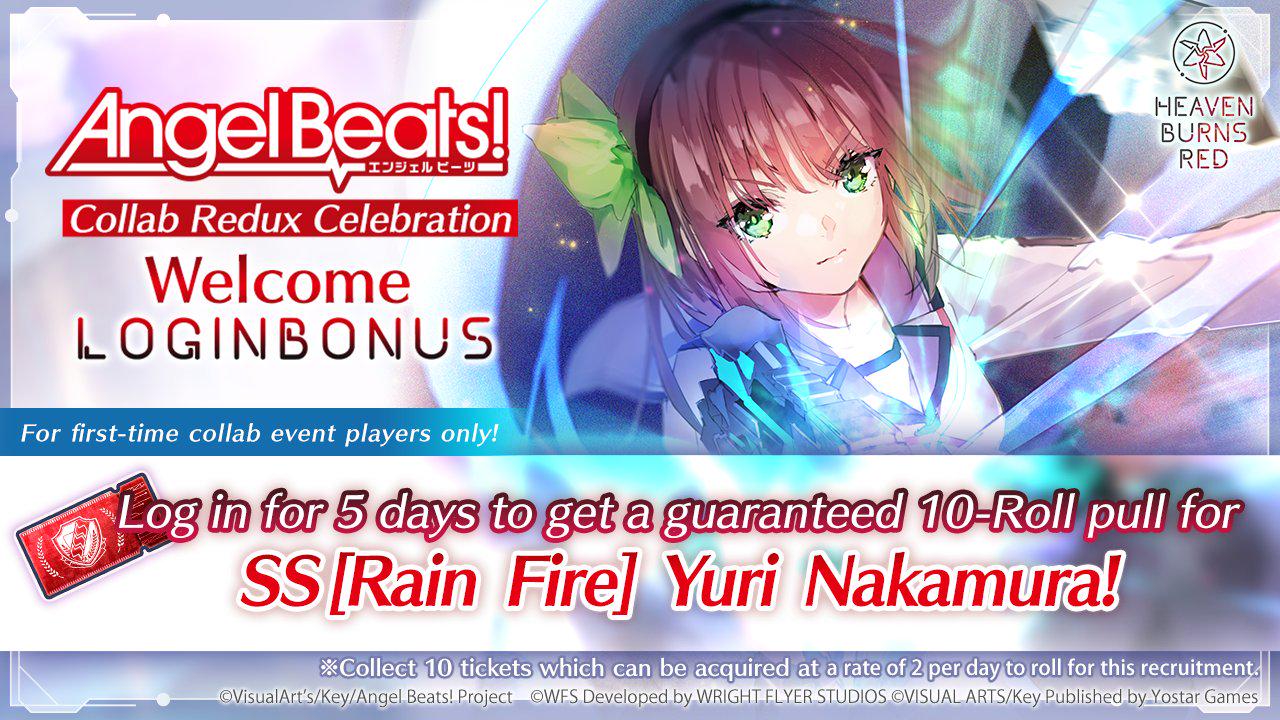 Оказывается под годовщину и коллаб запущен веб-ивент с рулеткой. О нем три дня никто не знал, потому что в официальных новостях его НИКТО НЕ ЗАПОСТИЛ. Интерн-кун, ну ебанарот. https://heavenburnsred.yo-star.com/collab-angelbeats2/ В день можно делать три спина. Может кому-то удастся получить кварц или билетики, мне пока не дропнулось ничего кроме мусорных книг опыта и раковых шкурок.