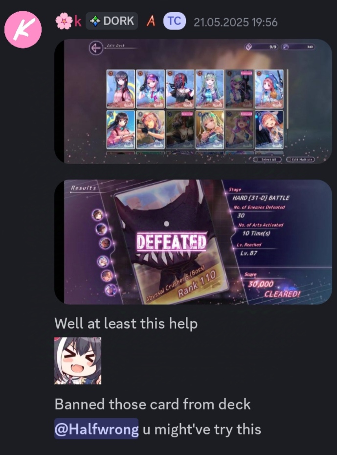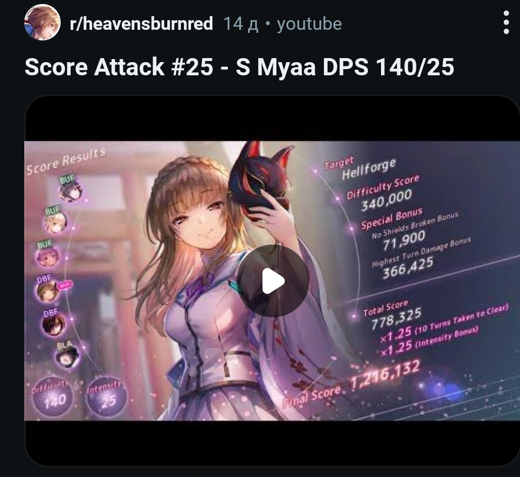 >>5592819 >Попробуй бластера поставить или фреджайл где то добыть. Да это в наличии почти на любой вкус и цвет. Может потом и пробну, но нет уверенности, что без любого дроча получится компенсировать очки от упавших дп полосок. Я больше хочу попробовать повторить проходку чела с реддита. https://www.reddit.com/r/heavensburnred/comments/1nl690z/sa24_3_turns_101mil_with_lb1_inori2/ Но единственного пазла, которого у меня нет - это Карен2, а Карен3 не умеет так ОД залить за 1 ход. Надо тут найти нужный ключик, Акари2 не может снести полоску без залива в нее баффов, а если их залить, то потом на Инори не хватит.