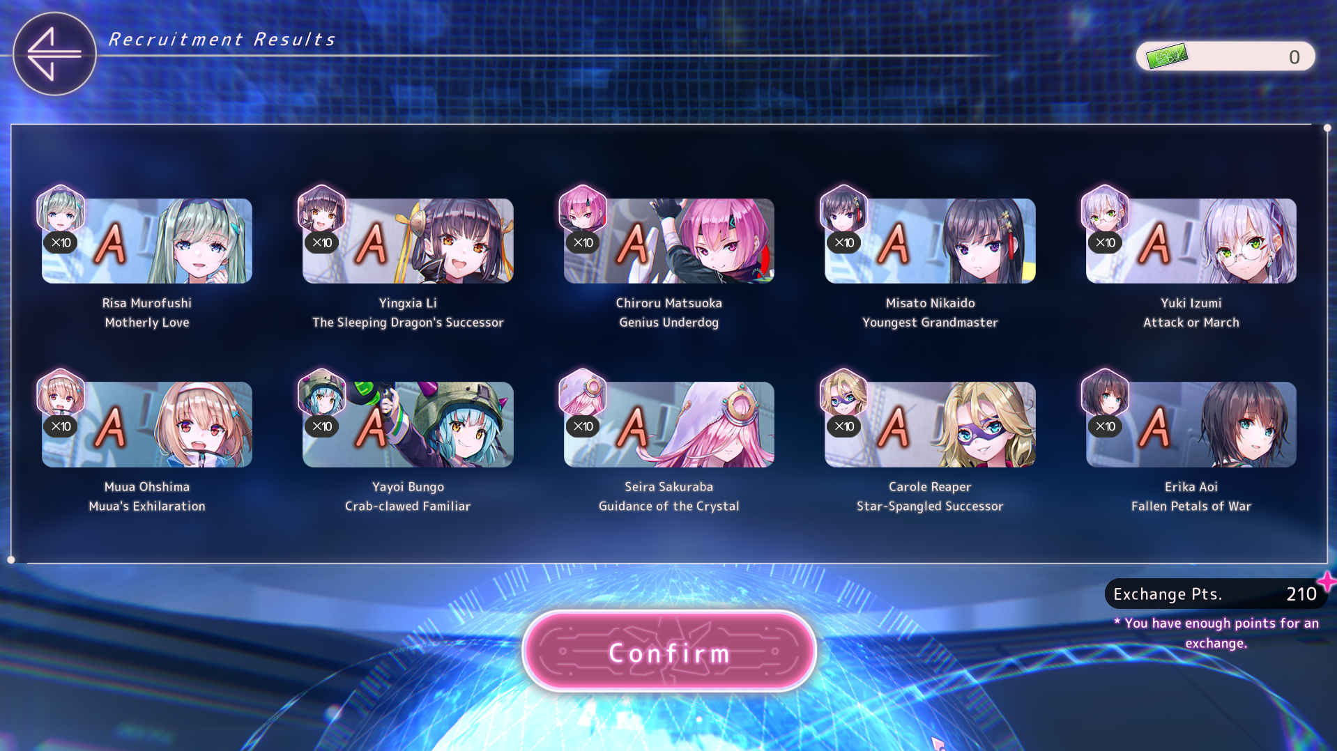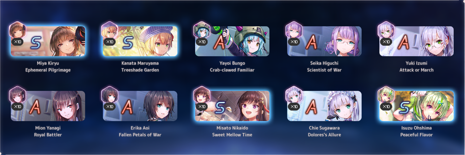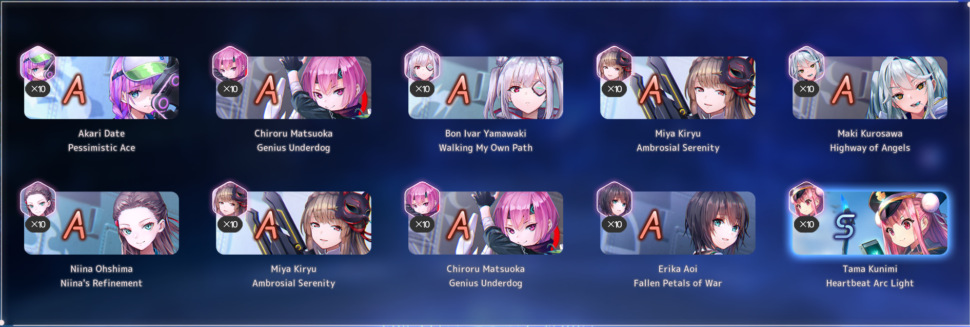 Я на дропы с зеленой гачи вообще не рассчитывал, изначально считал только четыре спарка с билетиков, а дропы взяли и пришли. Я залутал: Сейру; Фубуки; 2хМию; Юйну; Цукасу; Руку; Маки. Словом - неожиданный жир. К спаркам пока не притрагивался, сейчас буду думать, как ими грамотней распорядиться.