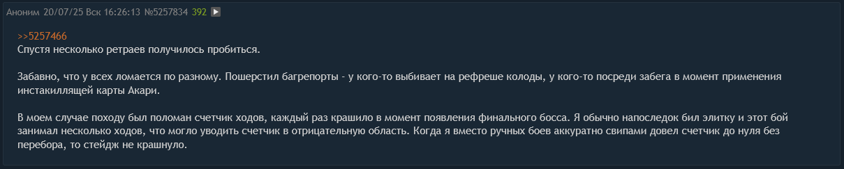 >>5888087 >Лб1 Ну кстати нормально. >Хватило двух эндлесс забегов, от них даже получил некоторое удовольствие за счет деки из вышескинутого гайда Тоже поначалу нравилось. Но если в аренке с боссом хочется напрягаться, потому что бои быстрые и всякие механики раскрываются, то в артс батлах хочется выкрутить меморию чтобы скипнуть этот фан от бесконечных боев с комарами и жуками.