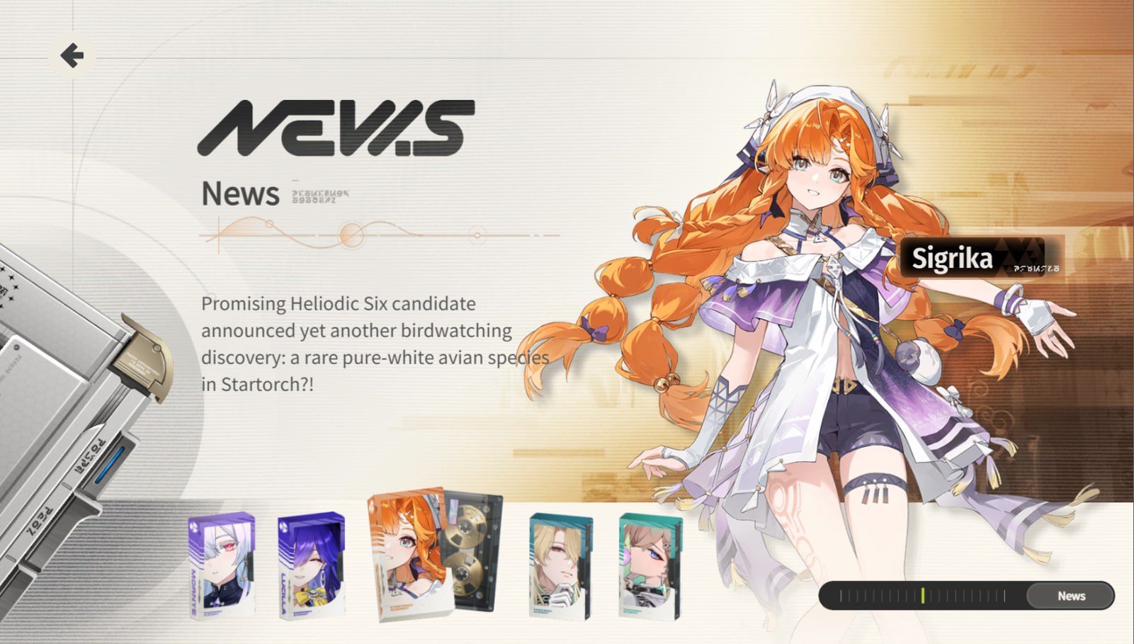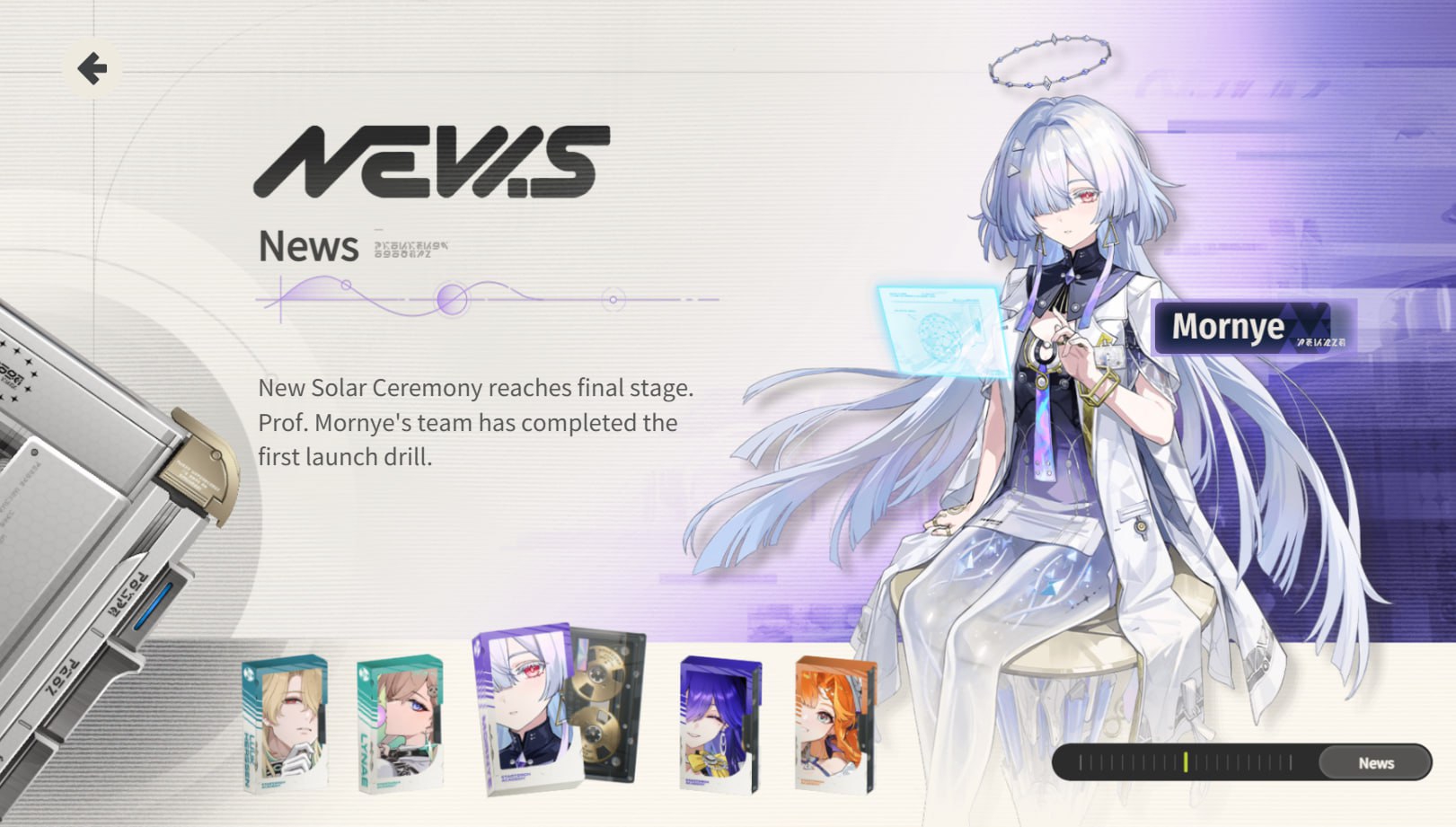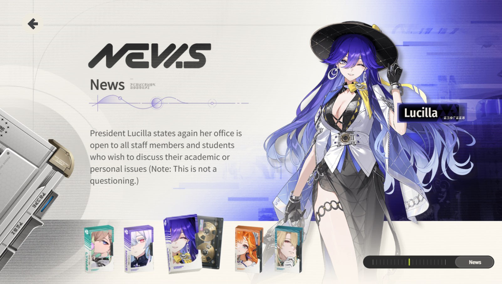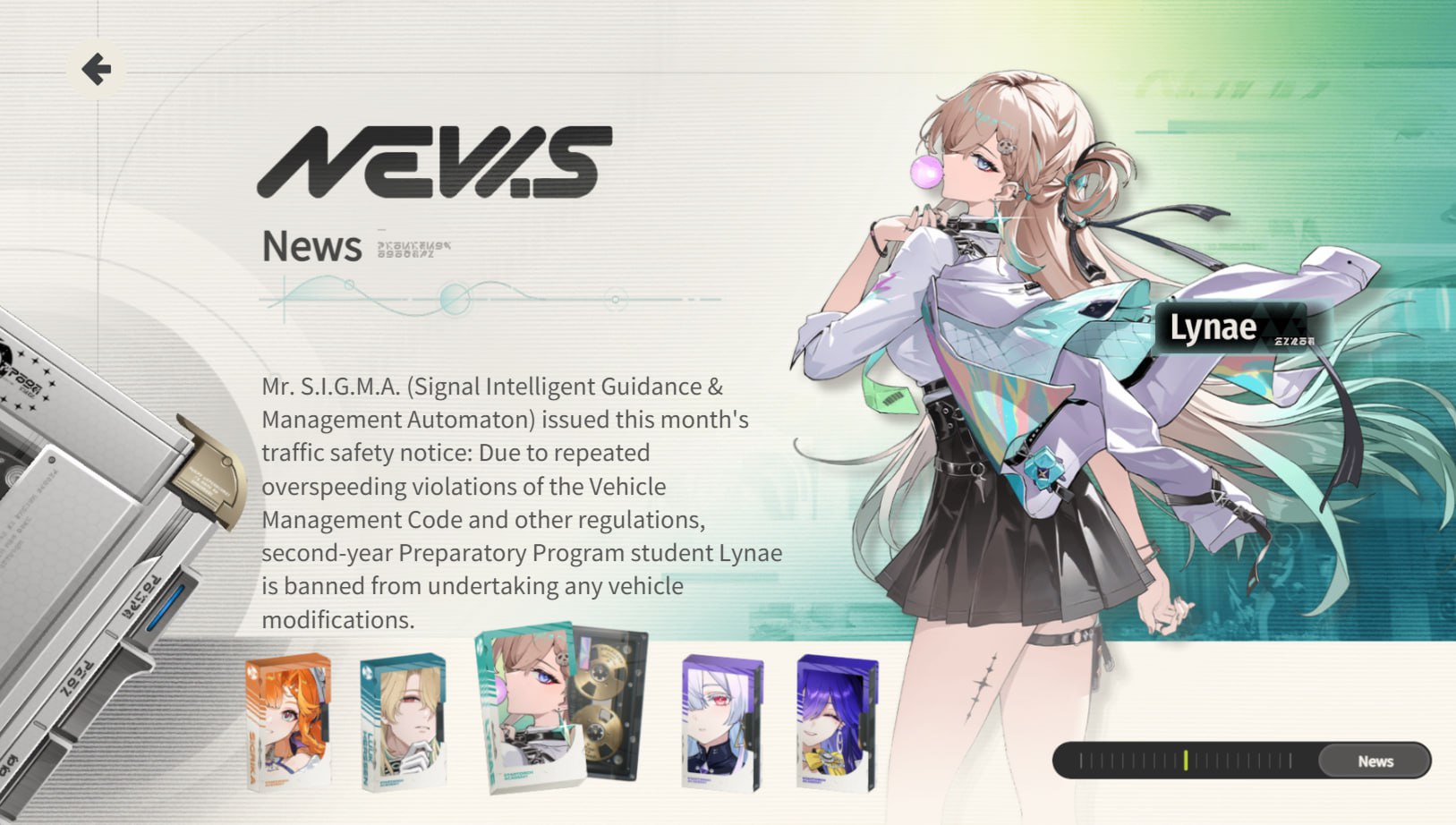 ★ Линея Мистер S.I.G.M.A. (Signal Intelligent Guidance & Management Automation) опубликовал в этом месяце уведомление о правилах дорожного движения: из-за неоднократных их нарушений студентке второго курса Подготовительной программы Линее запрещено проводить какие-либо модификации транспортного средства. ★ Морни Новая Солнечная Церемония выходит на завершающую стадию. Команда профессора Морни завершила первые пусковые учения. ★ Луцилла Президент Луцилла ещё раз заявляет, что её офис открыт для всех сотрудников, желающих обсудить свои академические или личные проблемы (Прим.: это был не вопрос) ★ Сигрика Многообещающая кандидатка Гелиодической шестерки объявила об очередном открытии в наблюдении за птицами: редком чисто-белом виде птиц в Академии Старторч?! ★ Люк Херссен В ReNU открыто новое отделение психического здоровья. Объявление доктора Люка Херссена в связи с этим: лазарет открыт для всех, кому нужна помощь с физическим или ментальным здоровьем.