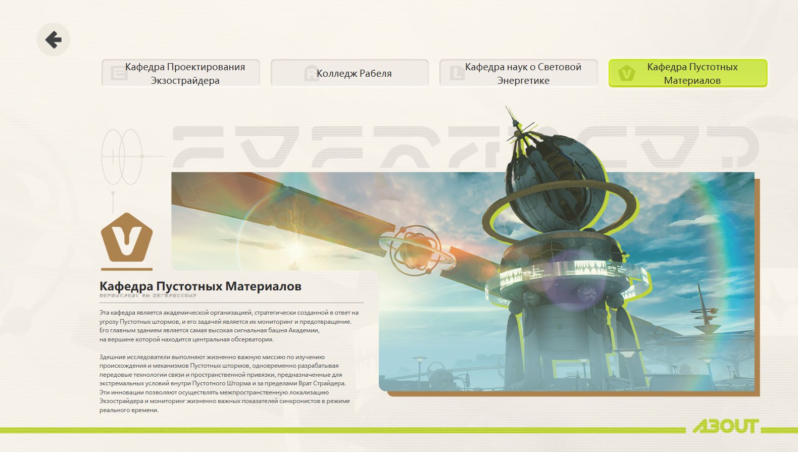 Исследовательский институт Полное название — "Глубокий космос: Исследовательский институт". Он входит в состав международного научно-исследовательского сообщества "Глубокий космос" наряду с Академией Звёздного факела и специализируется на передовых исследованиях, а также извлечении и трансформации технологий. Он соединён с транспортным узлом "Связной позвонок", возвышается над вершиной Гигантского меча и напоминает опоясывающее звёздное кольцо, с высоты которого открывается вид на землю Лахило.