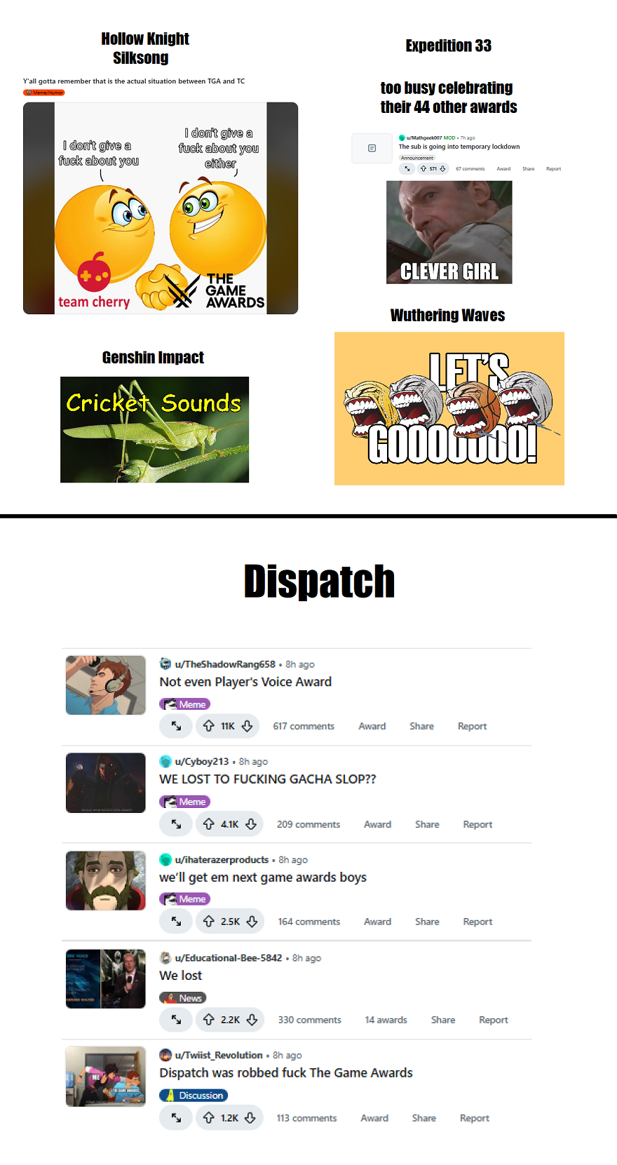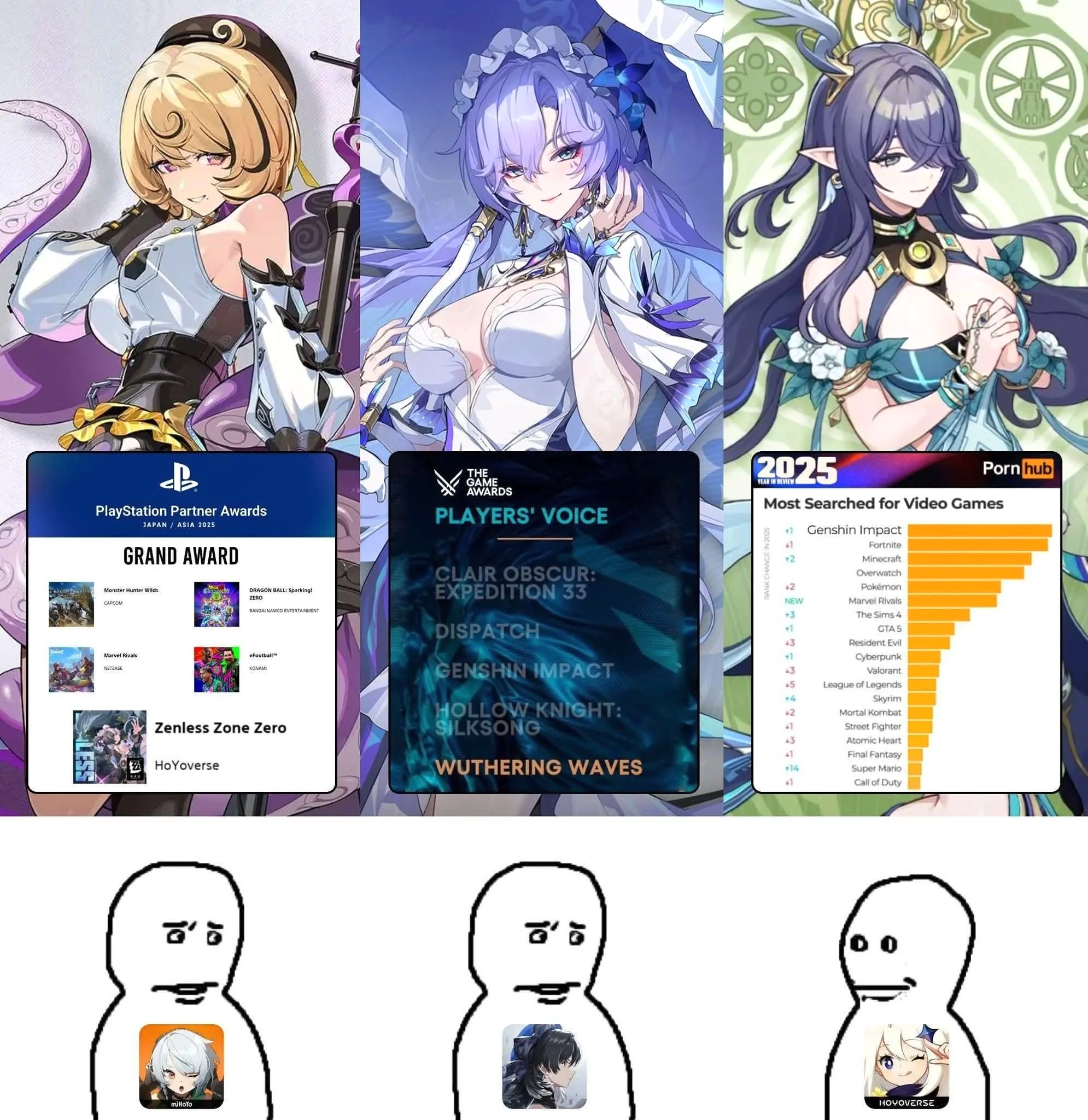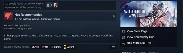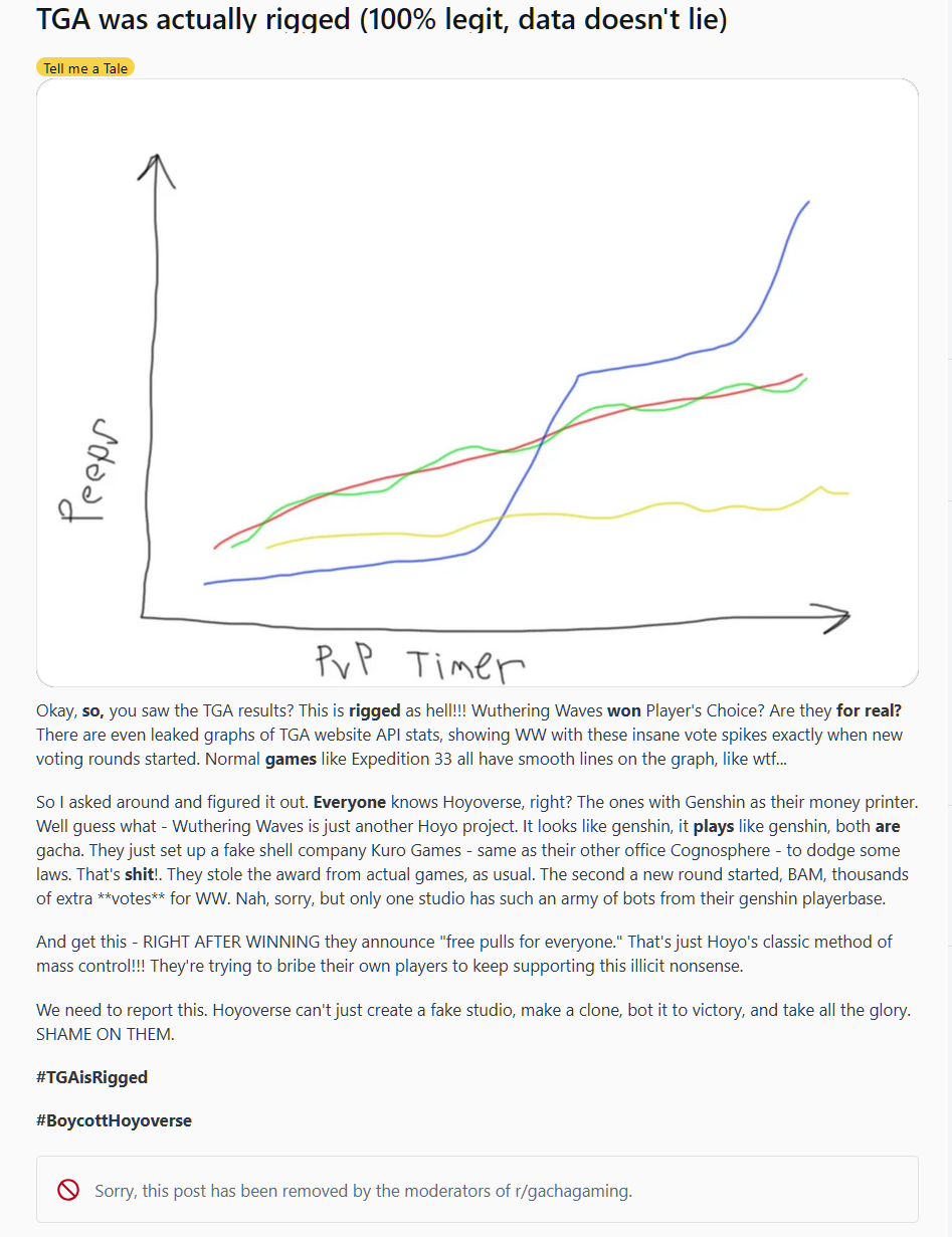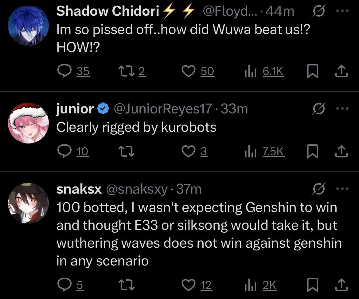 Поспрашивал задротов и разобрался. Слышали же про Hoyoverse? Ну у которых Genshin как денежный принтер. Угадайте-ка, Wuthering Waves это ещё один проект Hoyoverse. Игра выглядит как геншин, играется как геншин, обе гачи. Они придумали подставную контору Kuro Games по аналогии со своим вторичным офисом Cognosphere, чтобы избежать антимонопольных законов. Вот и постыдный результат. Обокрали нормальные игры, как обычно. Как только шёл новый раунд, В-С-Ё, тысячи лишних голосов за WW. Нет, простите, но лишь у одной студии есть такая армия ботов из игроков в геншин.