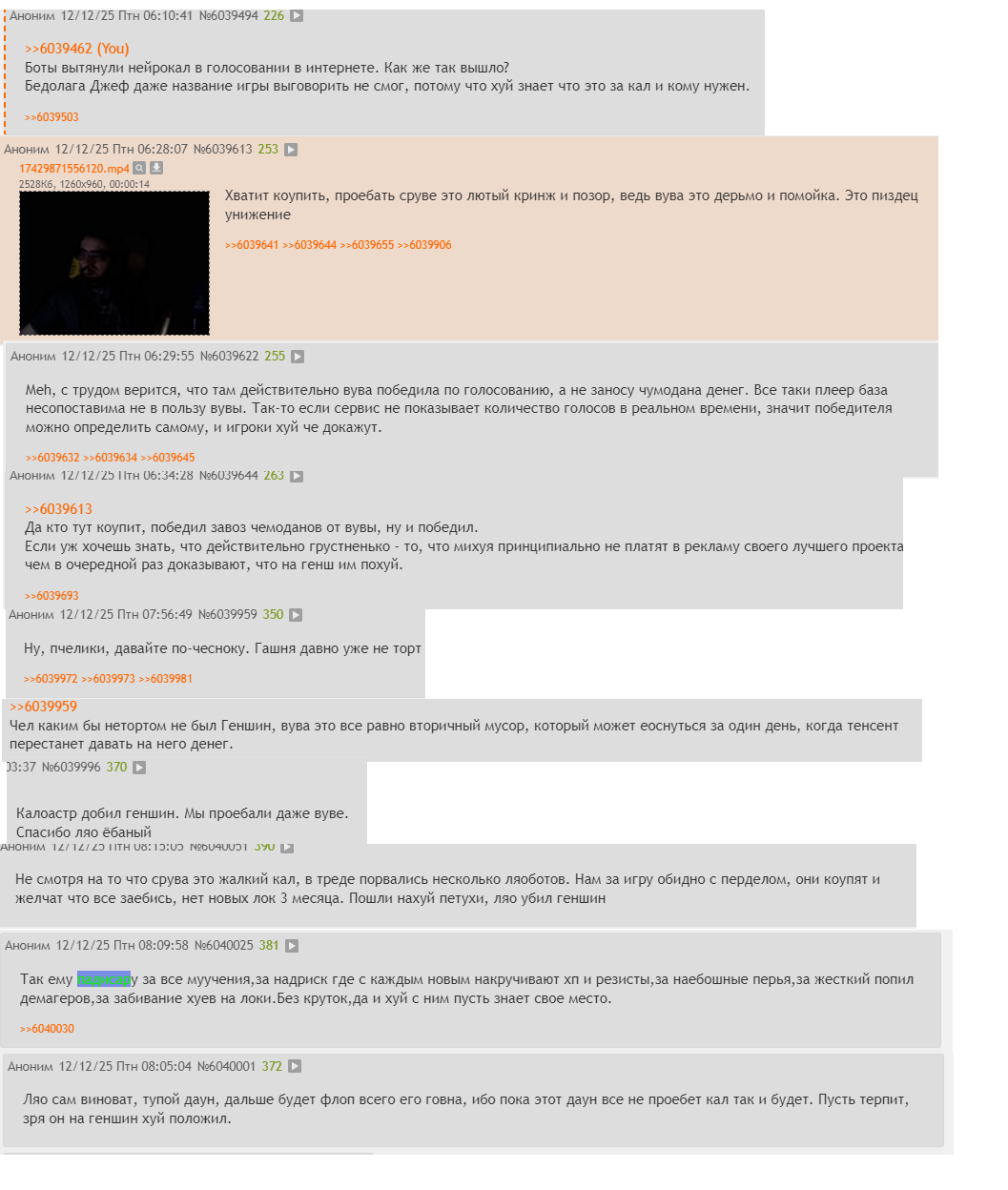 А прикиньте как геншинята охуеют, когда у них отнимут их последний аргумент - РУСИКА НЕТ! А ведь совсем скоро русик действительно релизнут и игра получит еще больший хайп. Ппц унижениям этих додиков нет предела: кокблоки, цензура, хуевое ляокачество, дойка лохов, топорные анимации, нейродристня вместо сюжета, отсутствие новых локаций по мать его 3-4 месяца. Это просто пиздец. И на этом фоне вува, в которой все происходит с точностью до наоборот. Ну мб только последовательный паверкрип присутствует, но щито поделать десу. Это гача. По делом вува макнула в собственное дерьмо геншин, да еще и отобрала награду от фанатов на ТГА.