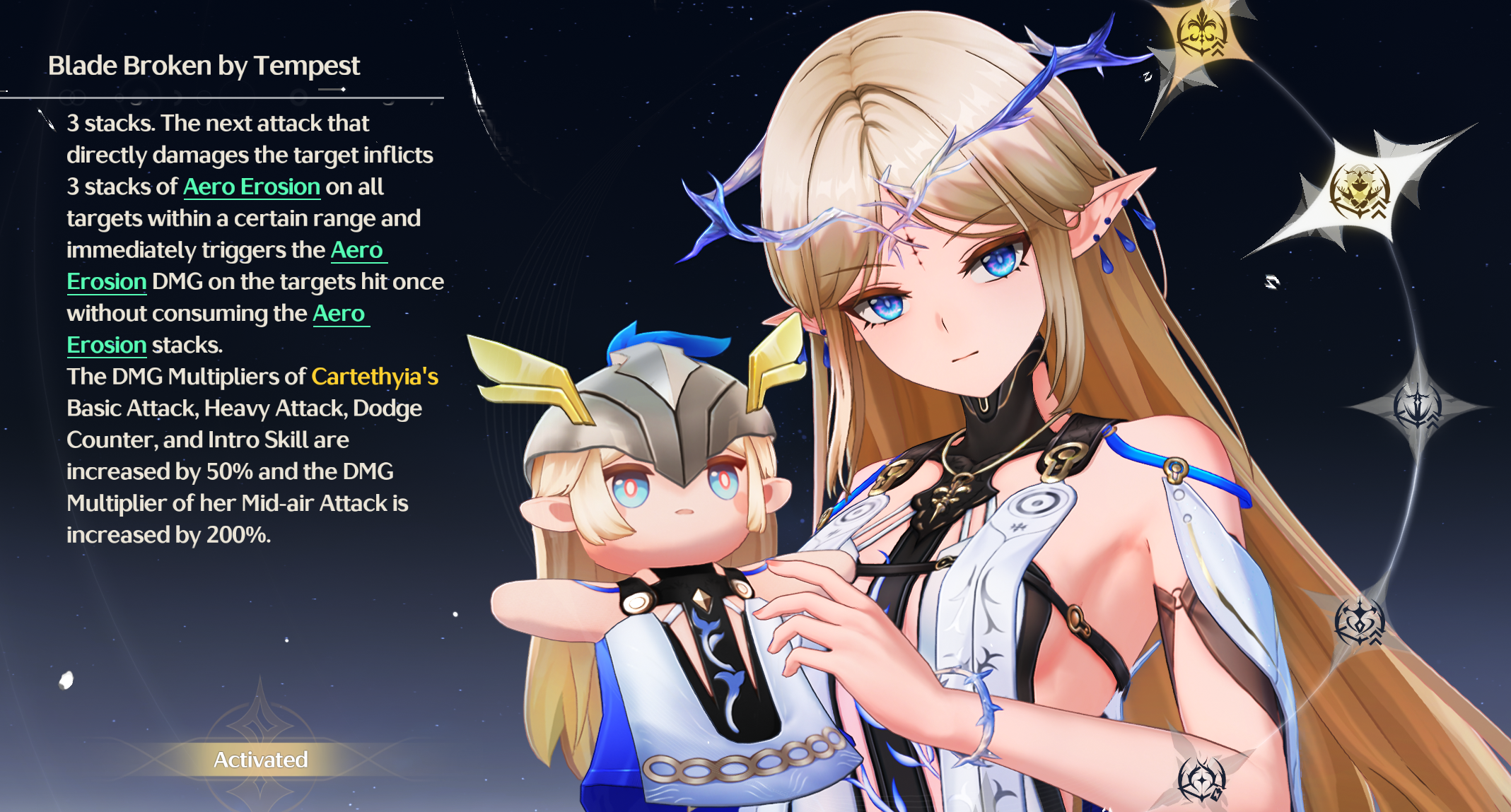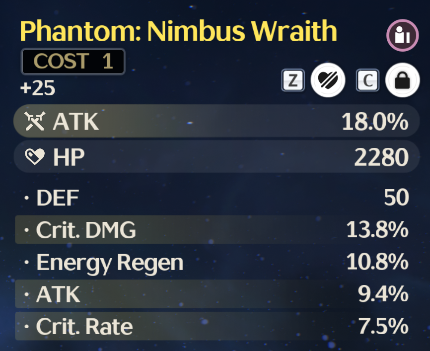 Фазовая рябь: Атака увеличена на 12%. После того, как персонаж в группе использует [Навык разрушения гармонии], его собственный бонус к урону по всем атрибутам увеличивается на 20% в течение 14 секунд.