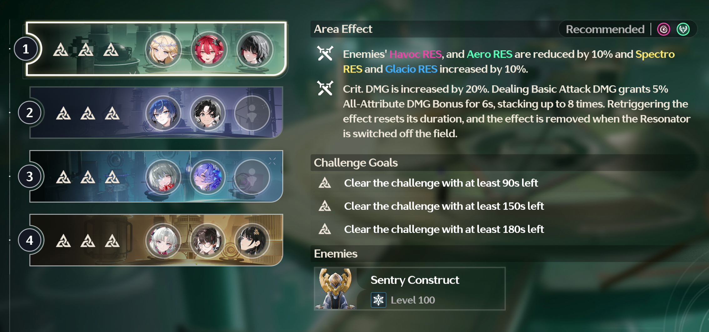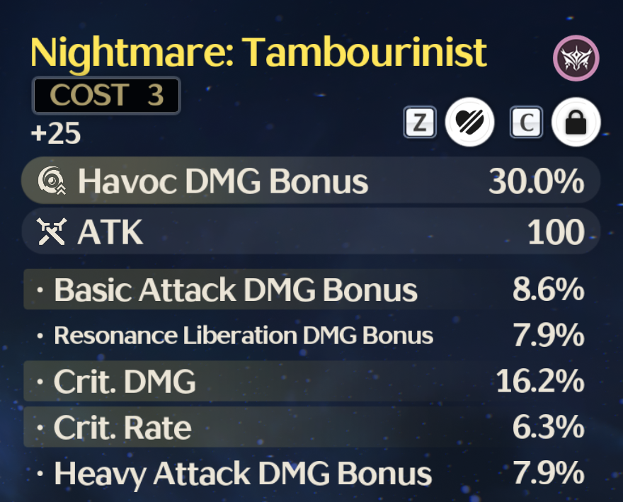 Пульсовый соратник: Атака увеличена на 12%. После нанесения урона врагу в состоянии [Вмешательство гармонии], бонус к урону от базовой атаки увеличивается на 6% в течение 3 секунд, суммируясь до 4 раз. Срабатывает раз в 0,5 секунды. Повторные срабатывания обновляют длительность. Звезда Бозе: Атака увеличена на 12%. После того, как персонаж в группе использует [Навык Разрушения Гармонии], его собственный бонус к атаке и урону от базовой атаки увеличивается на 12% в течение 14 секунд.