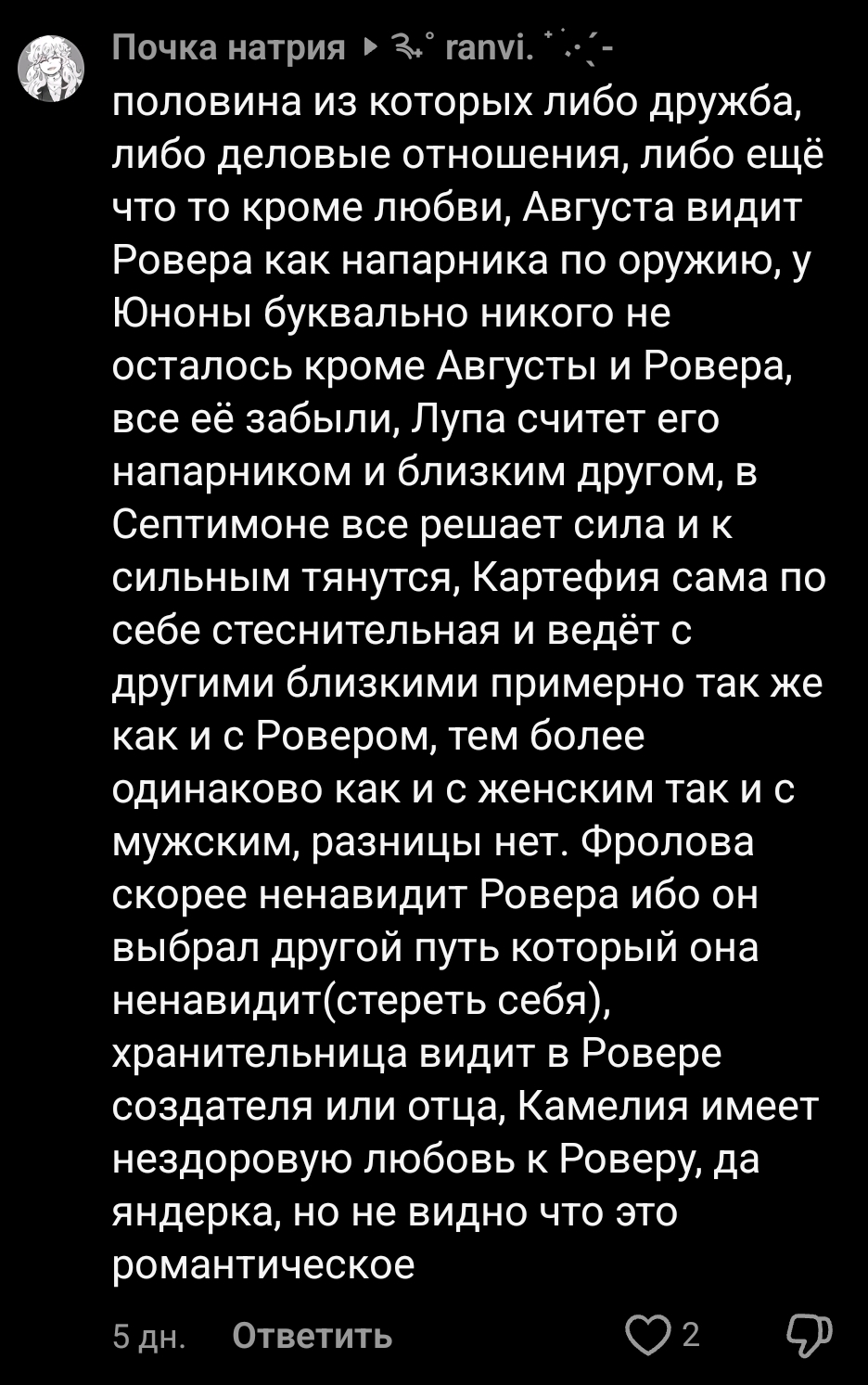 >>6044643 Щито поделать, её в игре просто нет, она как скин. Если всякие промоарты и анимации смотреть, у Роверов разный характер, он дединсайд немного, а Роверша слегка дура ближе к Чакконе. В игре у нас мРовер. Иногда только всплески жгг просвечивают, когда дурные позы с упором в колени принимает и пару кастомных анимаций. Вроде масложопили где-то что Роверов в будущем посильнее разделят и жгг перестанет быть скином, но не факт.
