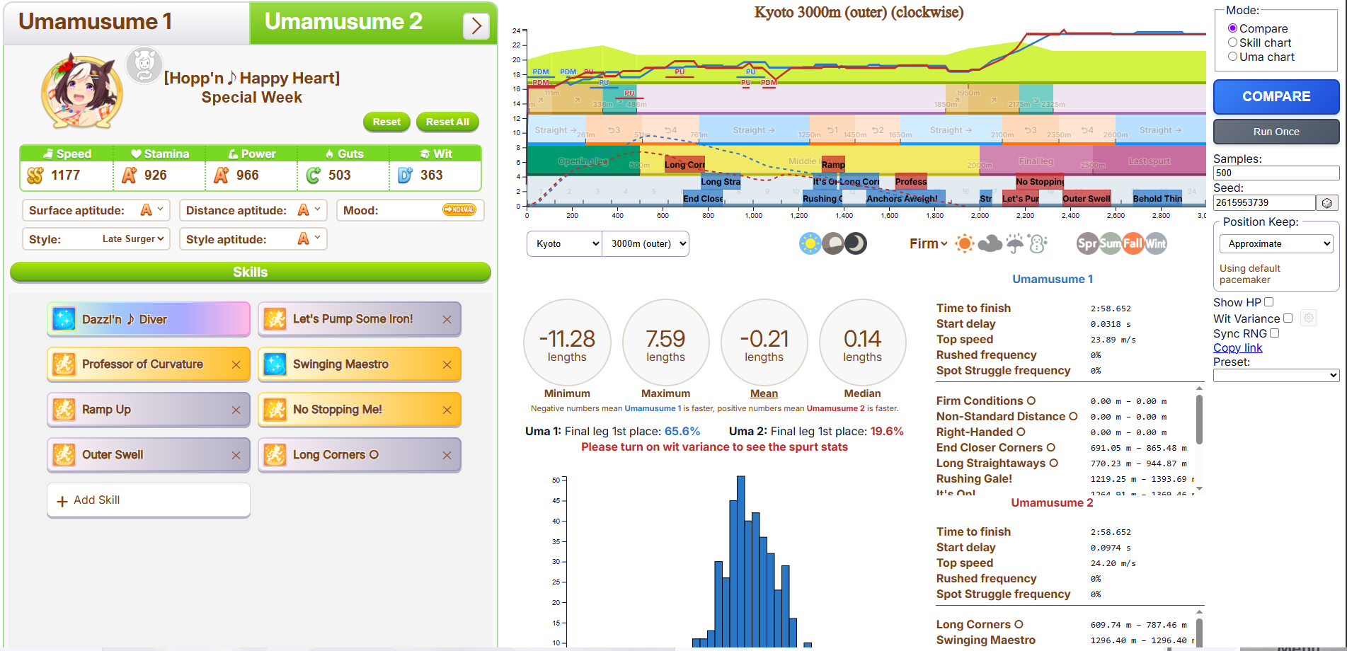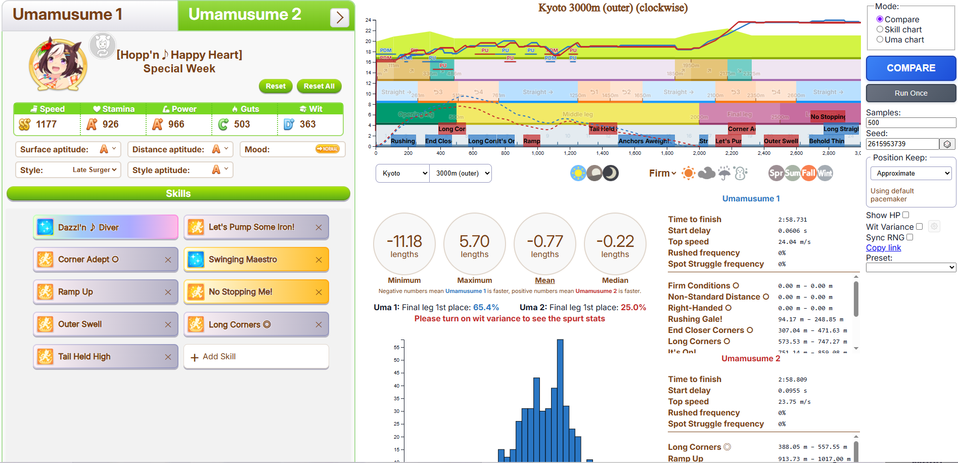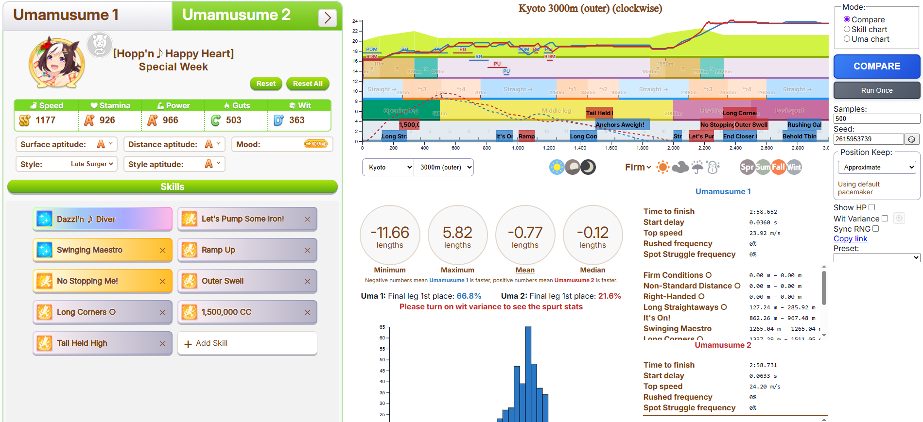 >>6054931 По японскому калькулятору это как примерно +981 стамины. Если сделать 4 скилла на 5.5% (т. е., ульта плюс три жёлтых) и один на 1.5% (т. е., один серый), то уже есть небольшая вероятность добежать до финиша, не выдохнувшись, а с 5 на 5.5% без скиллов на 1.5% уже почти 100% вероятность не выдохнуться. Но это ещё зависит от настроения, я с нейтральным настроением смотрел. У неё там, кстати, ещё могли быть зелёные скиллы на стамину.