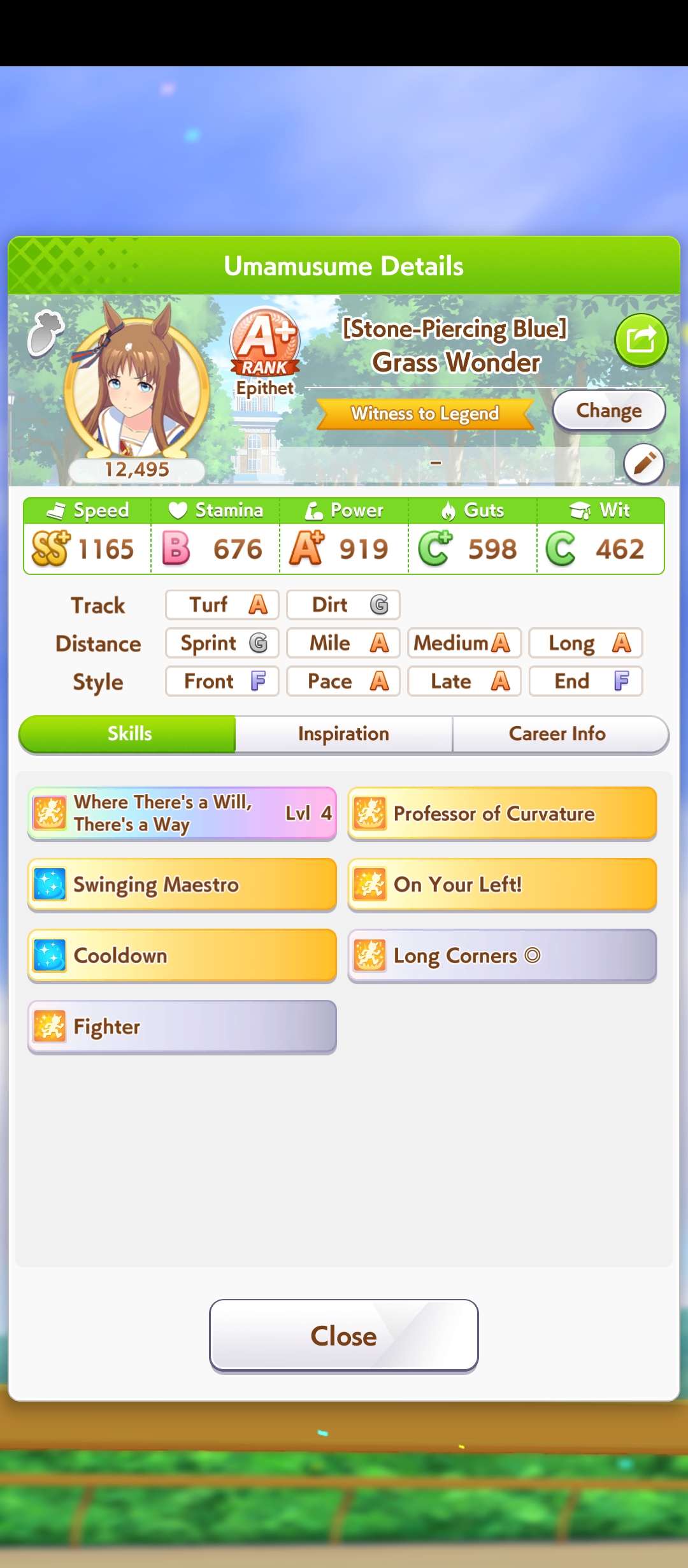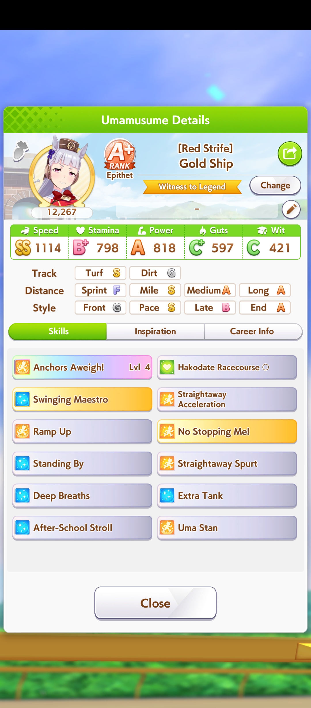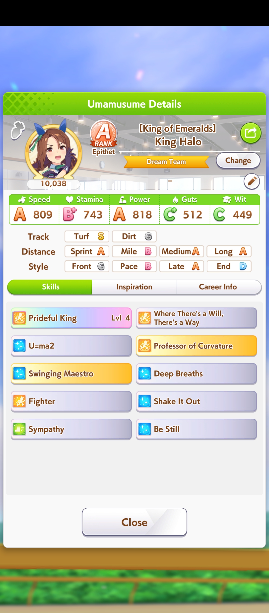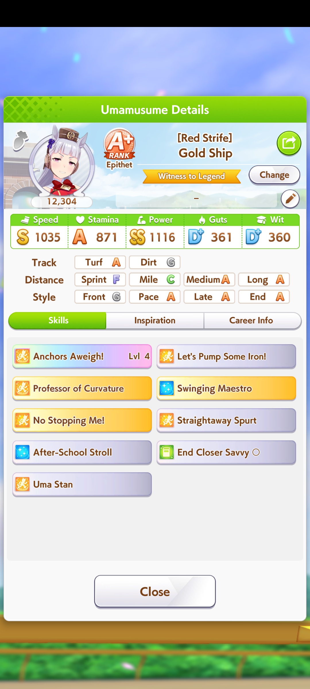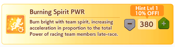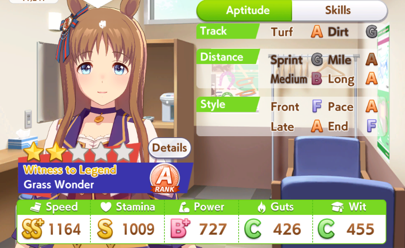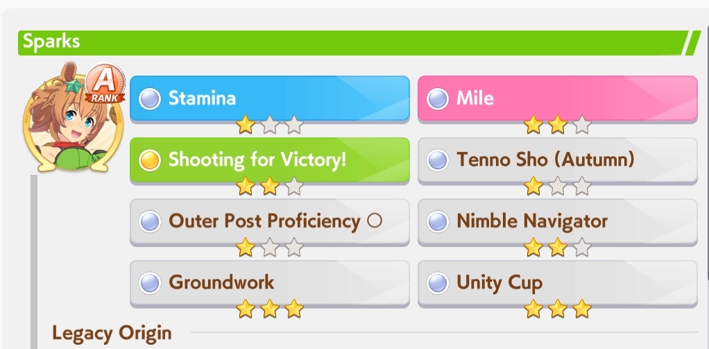 И на последнем месте даже с учетом недавнего бафа - гатс. Если к финишу бегут две +- одинаковые умы, то они борются за место благодаря гатсу, это что-то типо мотивации прибежать первее, на коротких дистанциях оно будет важнее стамины и мб важнее павы, но хз это только недавно ввели