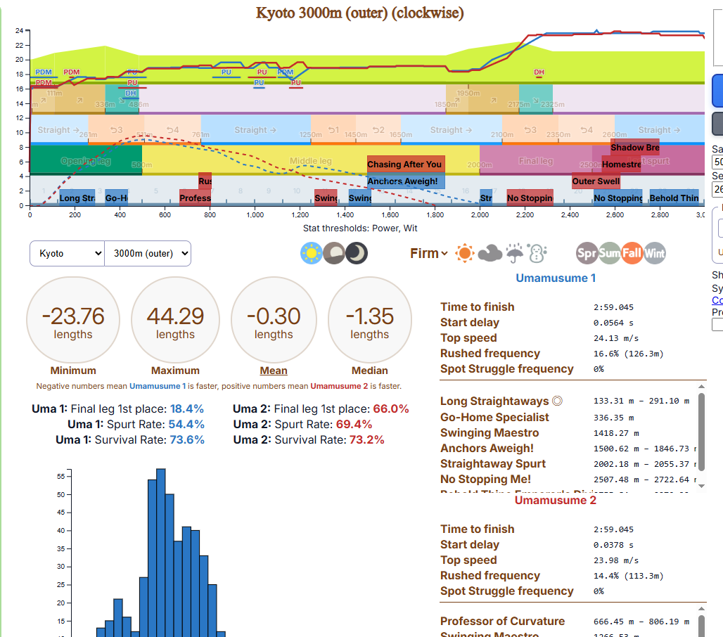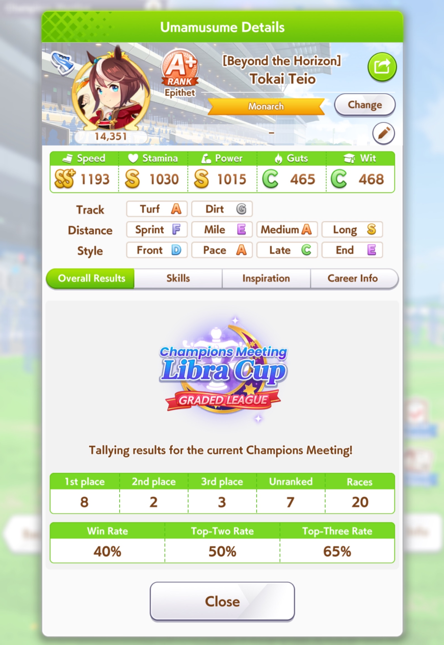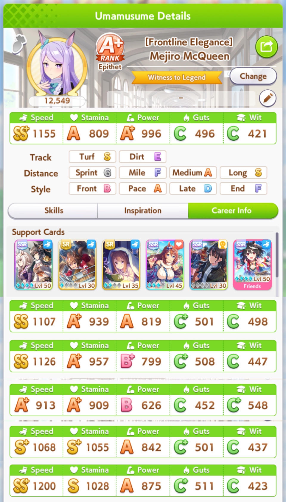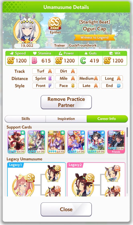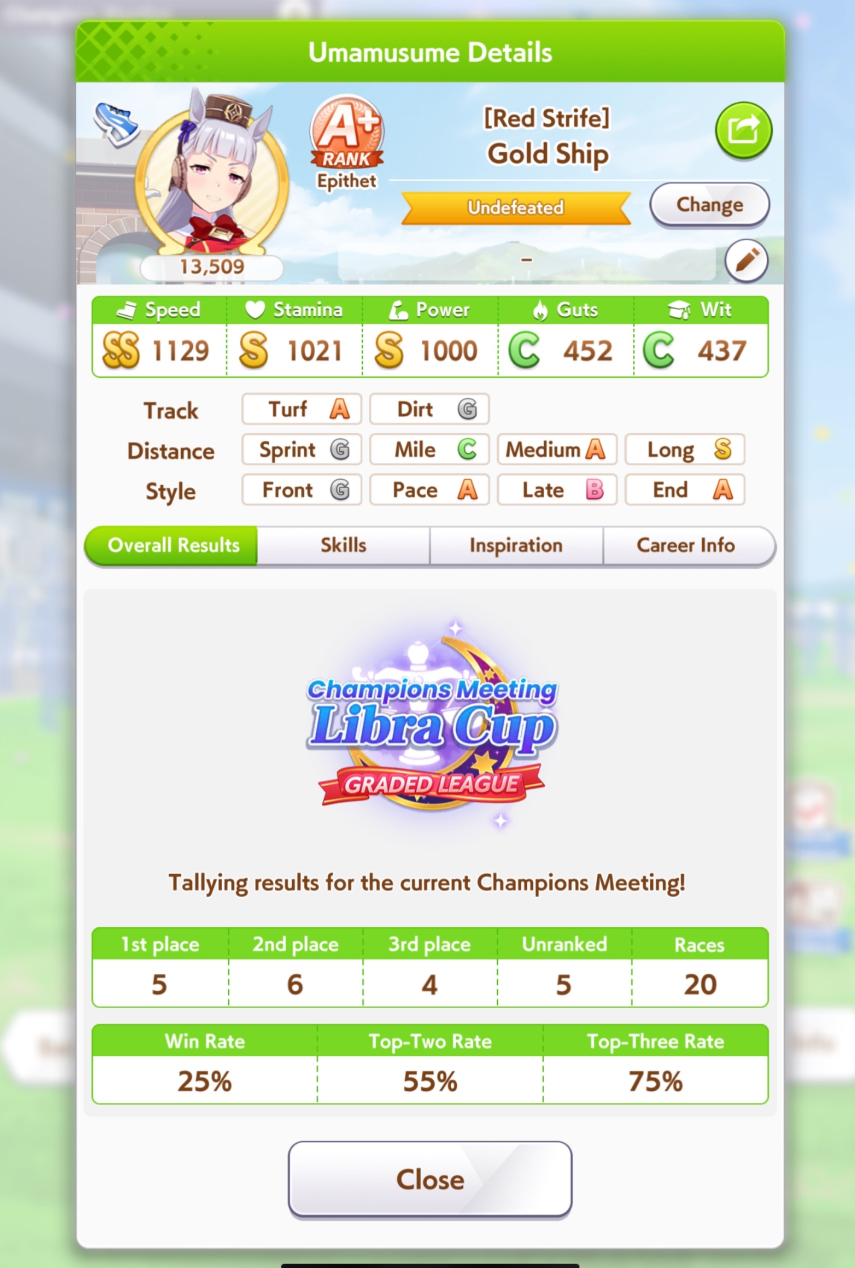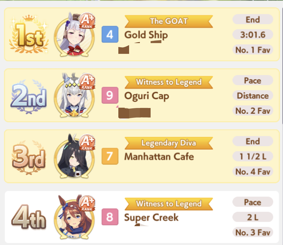 Но в основном, много людей с плохими лошадками, они пробивают 1200 в спд, но им откровенно не хватает стамины и павера. Кто пробивает стамина минимум с рекавери скиллами, у тех спида и павера не хватает. Во втором раунде по любому иначе будет, но самые слабые лошади, что я когда-либо видел в ЦМе в среднем. Всё-таки лонг - это реально стат чек, а не скилл чек. 1100 1000 1000 более чем хватает, чтобы выигрывать. Но есть одно но - это должна быть Голши или Тайшин. У меня слишком малая выборка, но вот реально, ноль шансов у кого-то ещё при прочих равных. Кафэшек прилично, но её тренить куда сложнее, хрен ты выбьешь статы как у Голши за 3 дня. Зачем я только время тратил на Огурца, вот реально, даже сильная Огури ничего не может против Голши. Весь топ в Голши, Огурец 3-5. Пэйсам пиздец как нужны акселерейшен скиллы, если оценивать по Японии, уже больше полугода класс только на медиумах и милях коупить может. Практически уверен, что лучше взять дебафера скорости и ебать эндов, чтобы повысить шансы на победу Голши.
