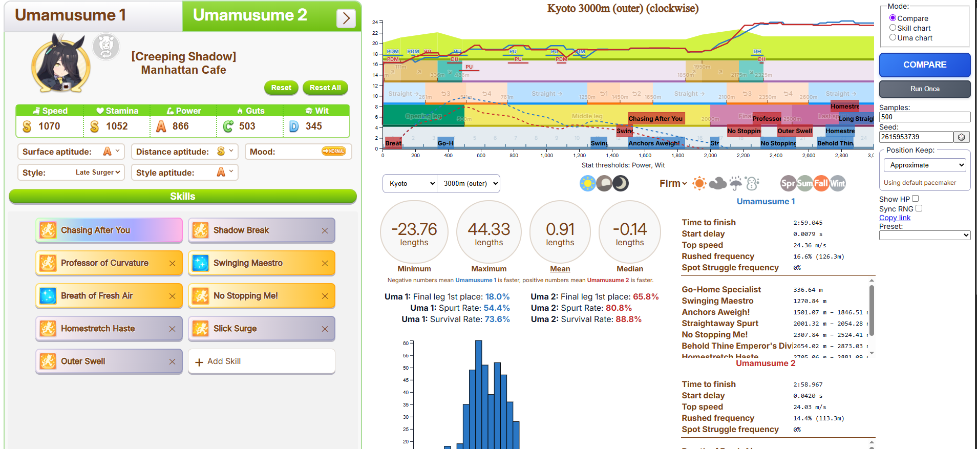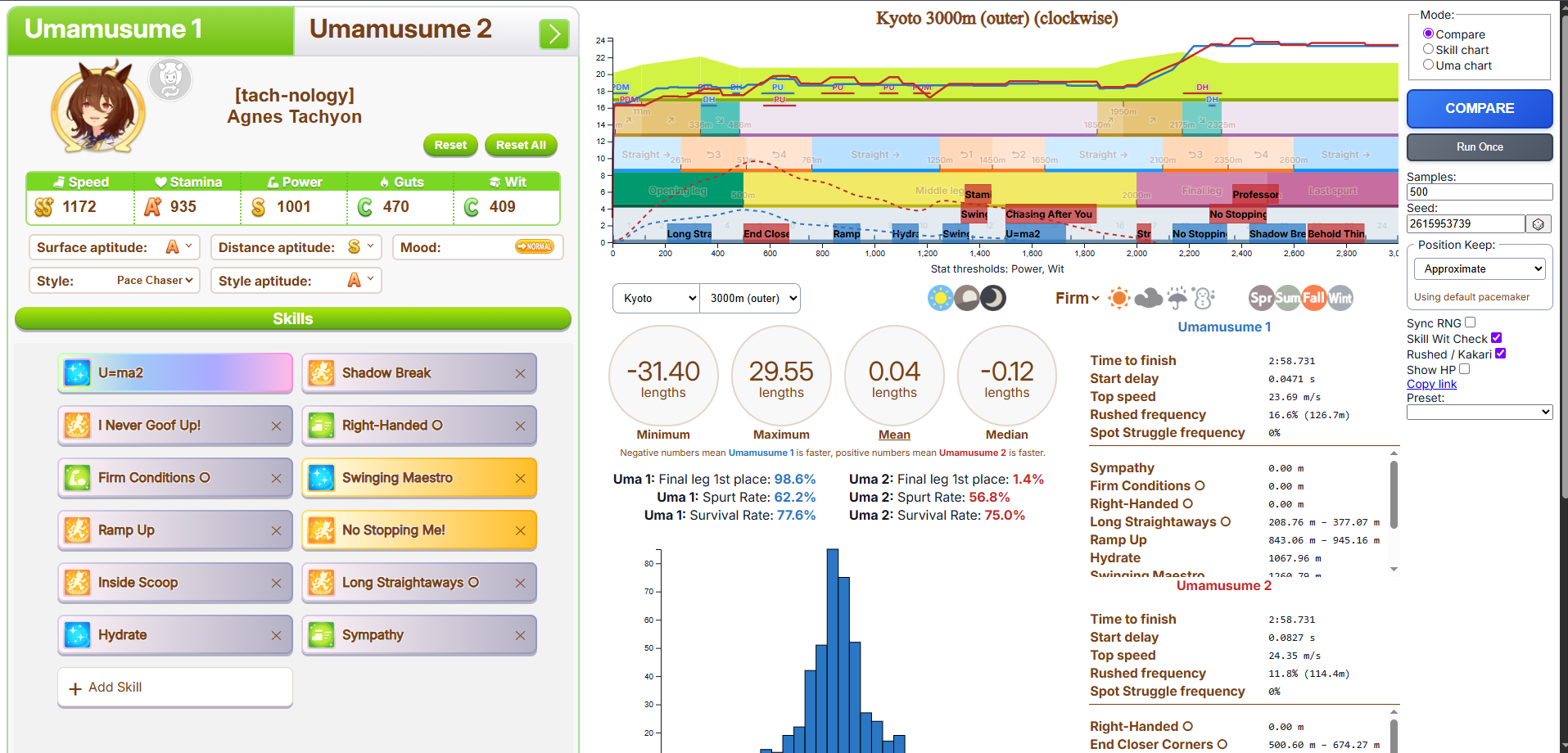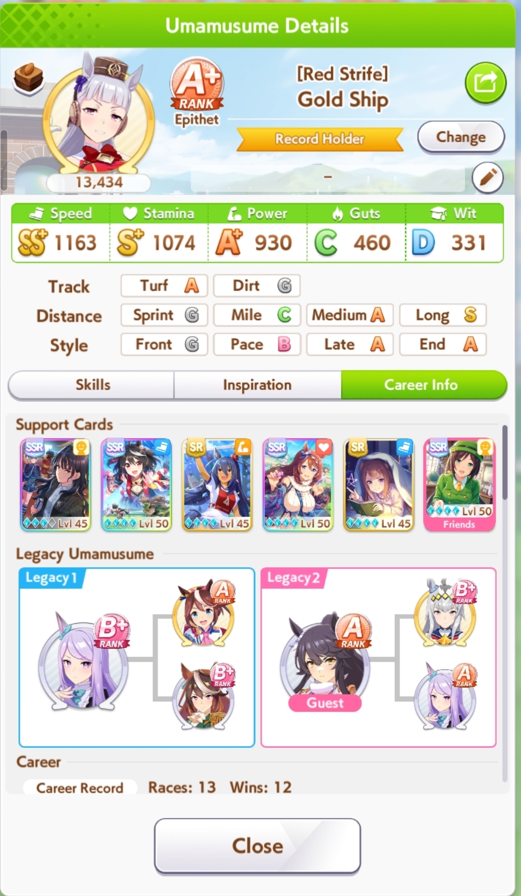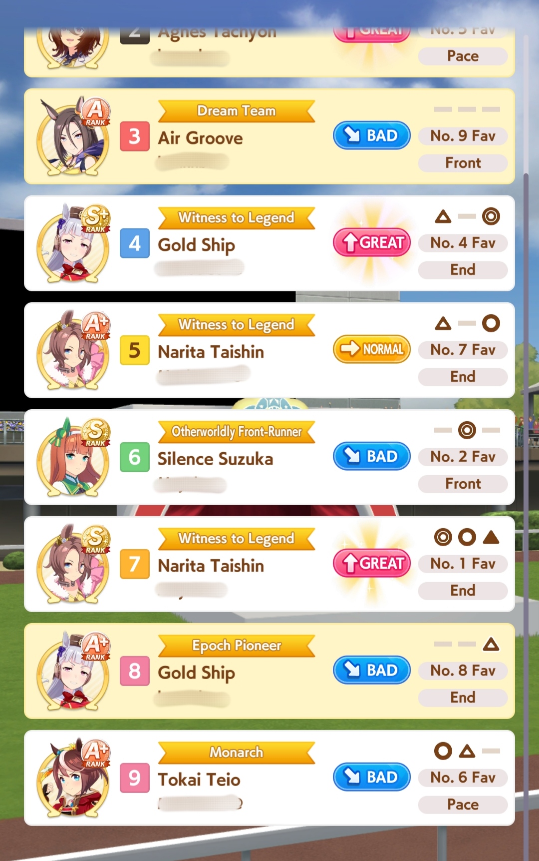 Но в основном, много людей с плохими лошадками, они пробивают 1200 в спд, но им откровенно не хватает стамины и павера. Кто пробивает стамина минимум с рекавери скиллами, у тех спида и павера не хватает. Во втором раунде по любому иначе будет, но самые слабые лошади, что я когда-либо видел в ЦМе в среднем. Всё-таки лонг - это реально стат чек, а не скилл чек. 1100 1000 1000 более чем хватает, чтобы выигрывать. Но есть одно но - это должна быть Голши или Тайшин. У меня слишком малая выборка, но вот реально, ноль шансов у кого-то ещё при прочих равных. Кафэшек прилично, но её тренить куда сложнее, хрен ты выбьешь статы как у Голши за 3 дня. Зачем я только время тратил на Огурца, вот реально, даже сильная Огури ничего не может против Голши. Весь топ в Голши, Огурец 3-5. Пэйсам пиздец как нужны акселерейшен скиллы, если оценивать по Японии, уже больше полугода класс только на медиумах и милях коупить может. Практически уверен, что лучше взять дебафера скорости и ебать эндов, чтобы повысить шансы на победу Голши.