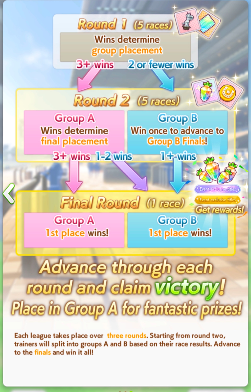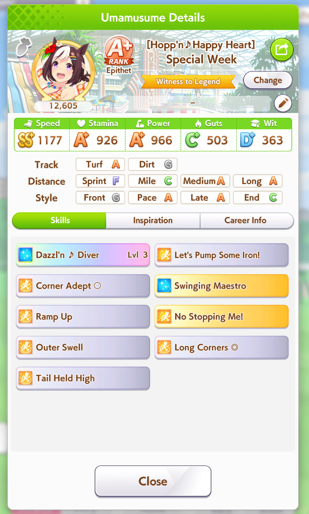 >>6053407 >Но я просто не могу понять какие кнопки жать... Как я понимаю тут даже нету "левелов" которые можно прокачать чемпиону Ну какое-то подобие лвлов здесь есть, оно правда называется рангом и складывается от твоих статов и скиллов, от G до SS, считай 1й уровень чара и 17й. Прокачиваешь этот уровень с помощью саппорт карточек (можешь по началу автовыбор ставить и пробовать так) в карьере URA (режим обучения) или Unity cup (чуть продвинутая карьера), можешь по началу автовыбор ставить и пробовать так. Тебе надо сделать работающую лошадь у которой должно быть много скорости и достаточно стамины, чтоб добежать до финала, а для этого надо жать соответствующие тренировки
