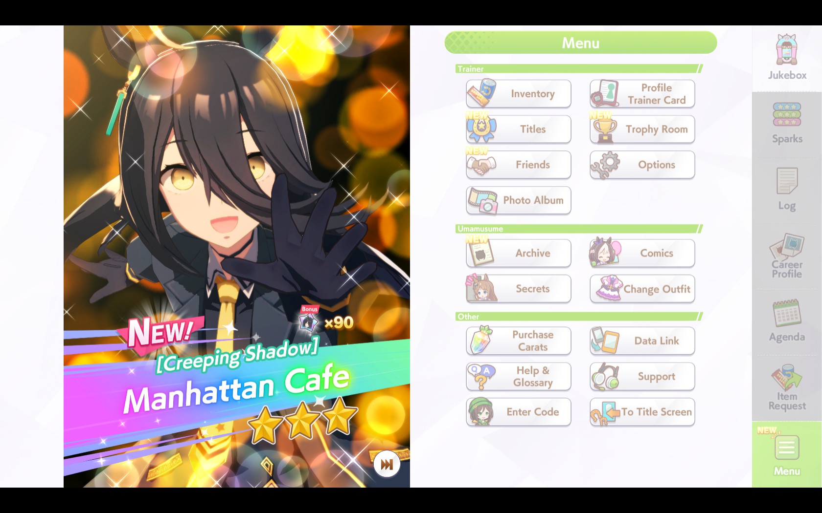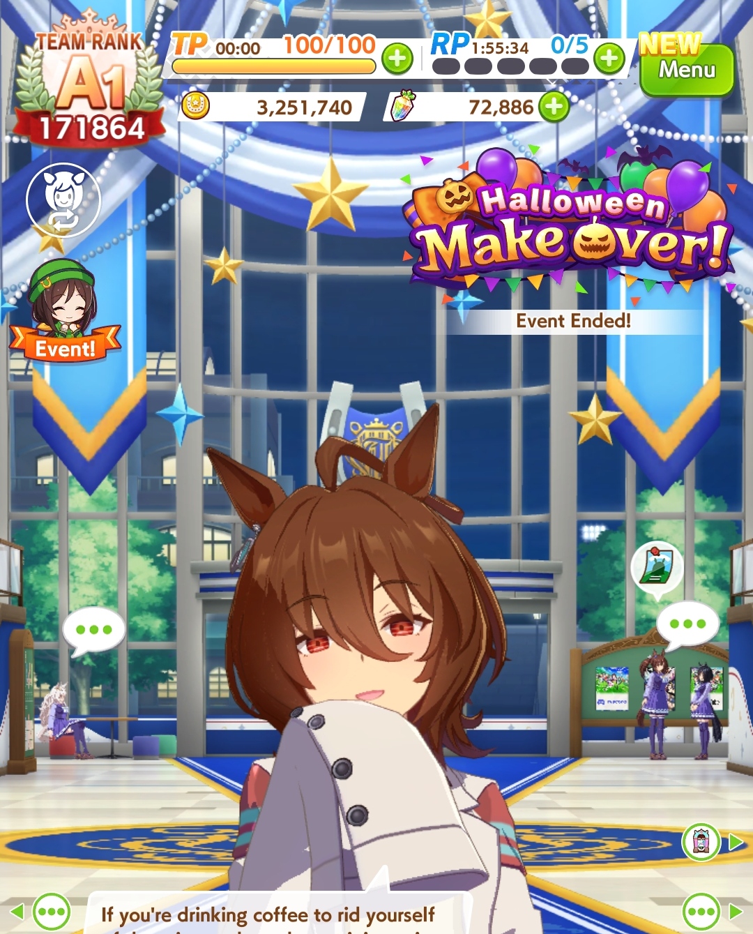 Алсо там первые 4 истории как бы показывают о том, что было перед тем, что в режиме карьеры, и являются как бы последовательно идущим сюжетом, как тренер с лошадью познакомился и заключил контракт. А с пятой по седьмую истории уже показывают всякое более позднее, и не очень связное (типа например как в летнем лагере уединились в лесу и занялись тем-то и тем-то). Так что не стоит ожидать, что там будет какое-то прямое непосредственное продолжение первых четырёх стори. Но именно истории Кафе я не читал.