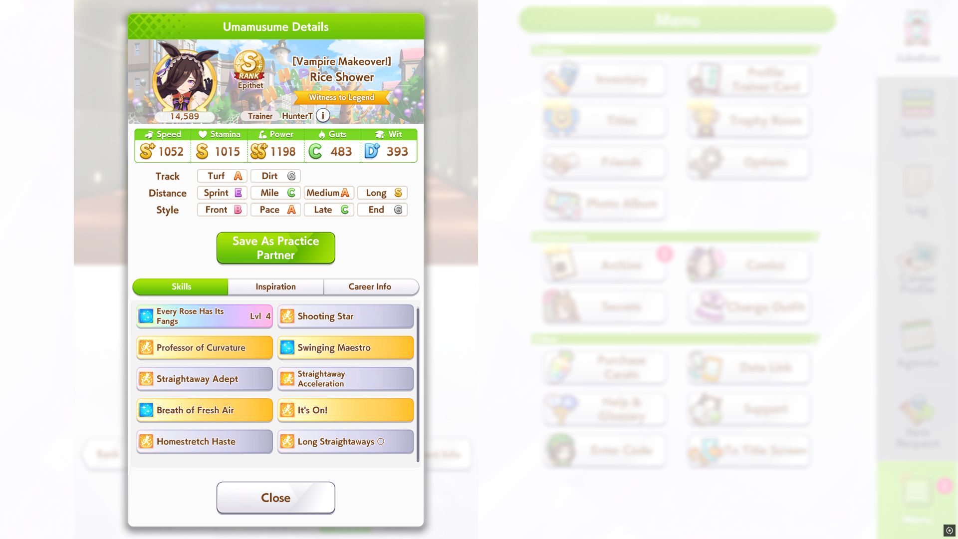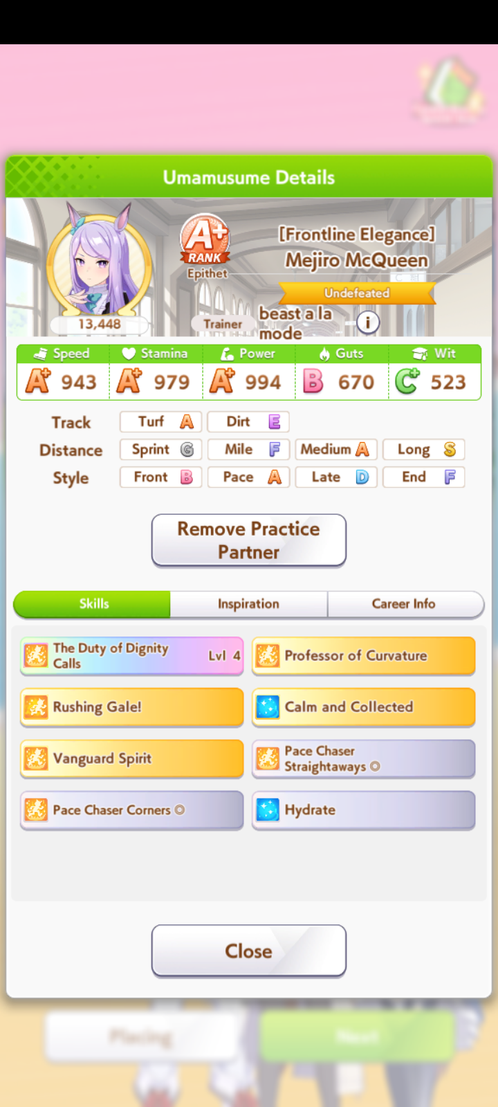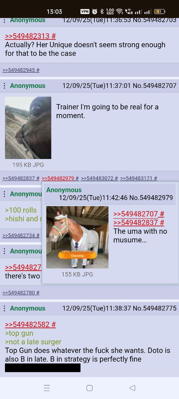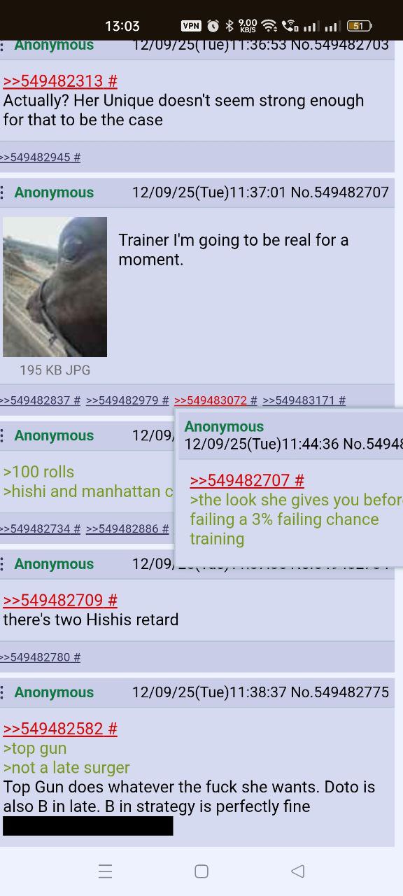 Голшип опять тренироваться не хочет. Два забега - в первом пробила 1000 стамины при 800 спида, во втором - 1100 спида при 780 стамины. 3 спд/2 стм/1 инт сборка, все что мог ей сделал. Походу сосну в турике, ибо у меня две из трех лошадей это лейтеры с 1000-1100 спида. Зато эти каловые голшипы как родители внезапно хороши. Вообще чаще родителей фармлю с нового режима чем с ура финала