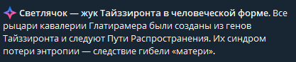 💫 Светлячок — жук Тайззиронта в человеческой форме. Все рыцари кавалерии Глатирамера были созданы из генов Тайззиронта и следуют Пути Распространения. Их синдром потери энтропии — следствие гибели «матери».