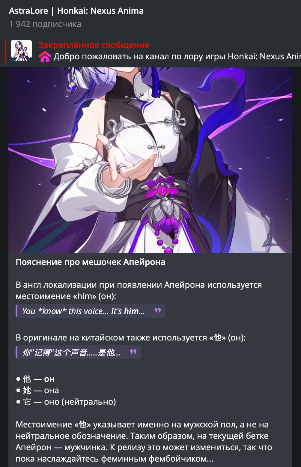 Жаль, что Шаоджи полноценно не дадут арку писать. Он ведь опять напишет пару базированных глав, а потом все отдадут на фриланс какой-нибудь паймоне, которая будет писать про своих боевых падисариков. Такова судьба этой проклятой игры, увы