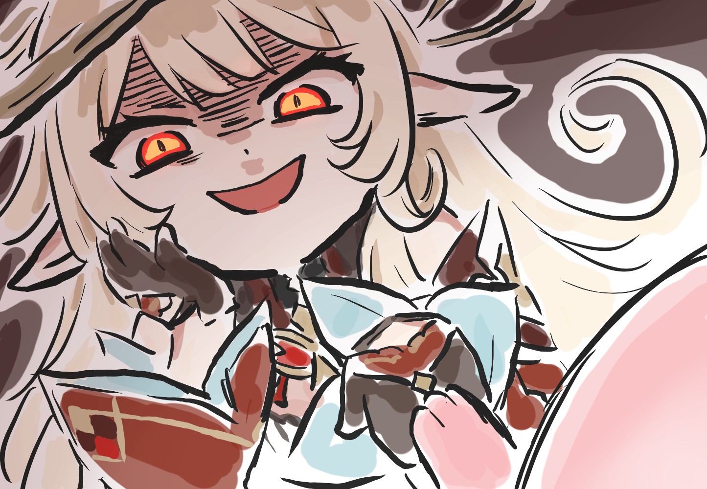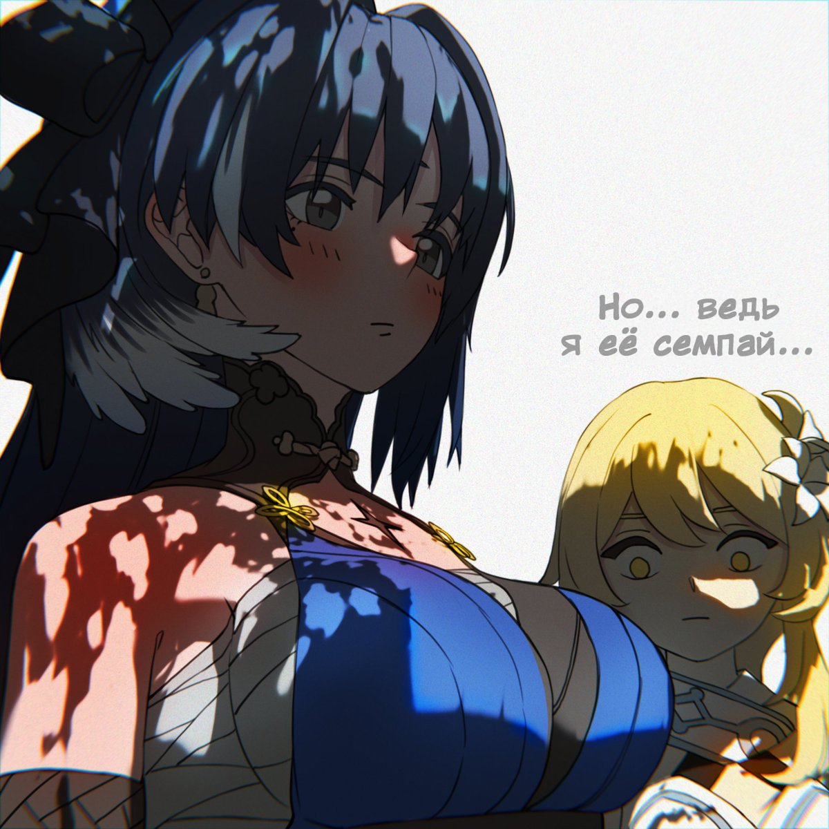 - Чего это она гонит такое? – Сянка посмотрела на архонта. Чжун Ли, бледный как смерть, механически теребил себя за запястье. Повариху он не слышал.